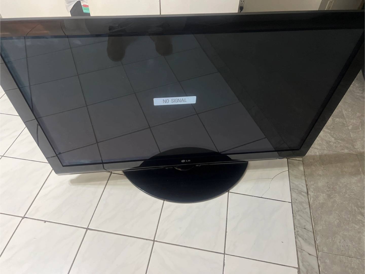 Large black flat-screen television. Features a rounded base. With the right setup, you can enjoy a cozy movie night.