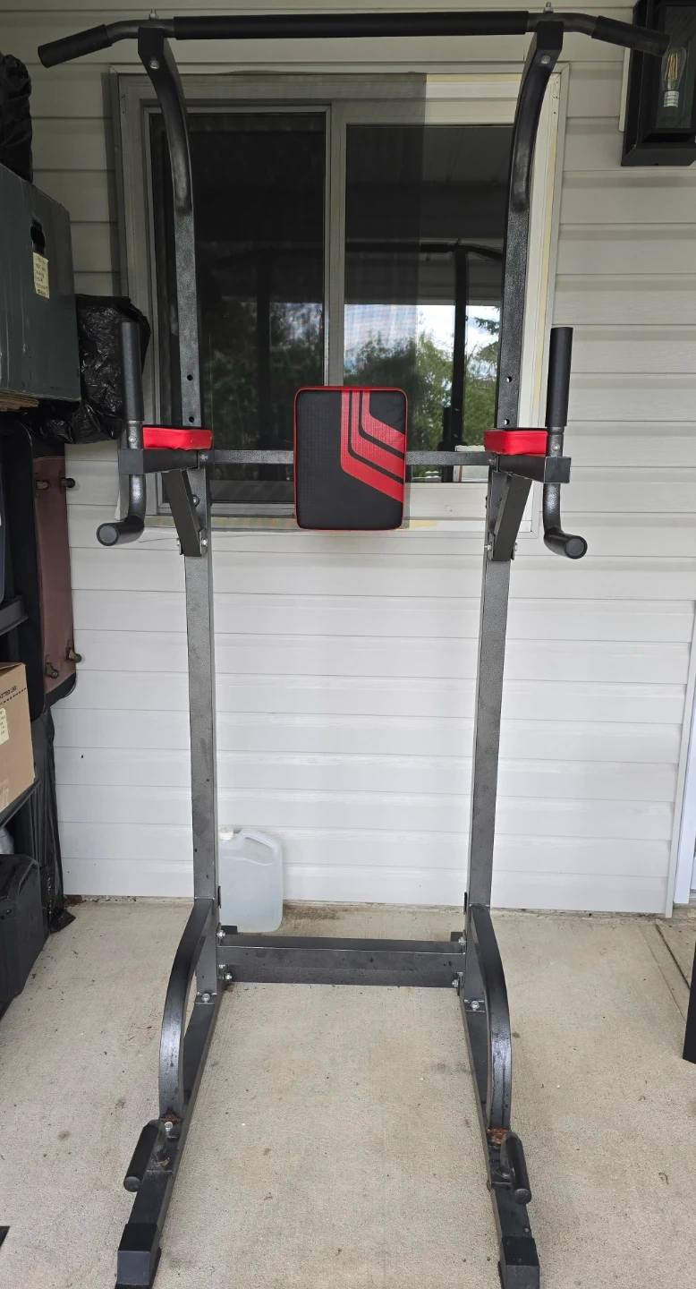 This power tower offers pull-up, dip, and leg raise stations. It's made of sturdy steel construction with padded grips and back support. It's a versatile piece for home fitness routines.