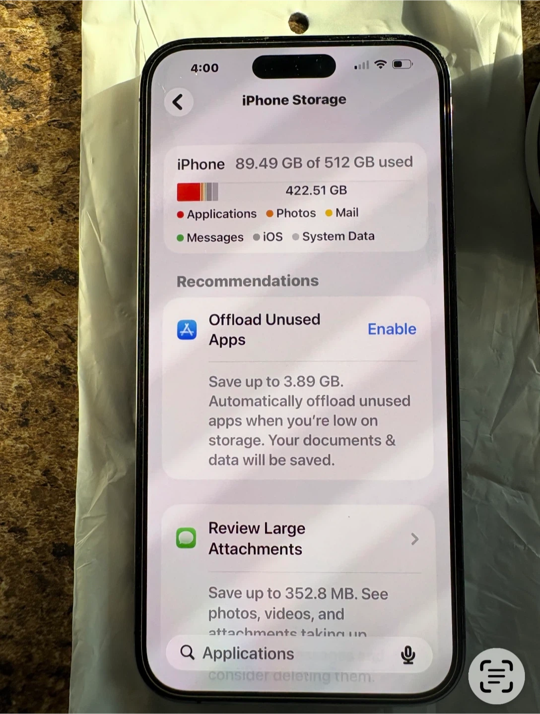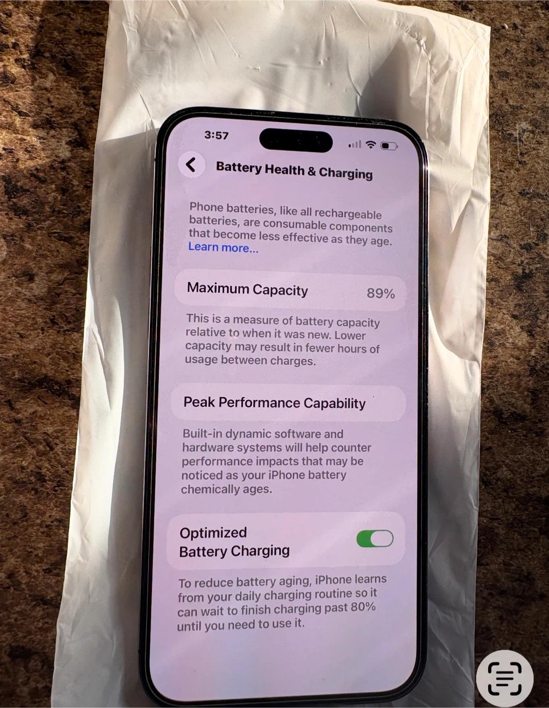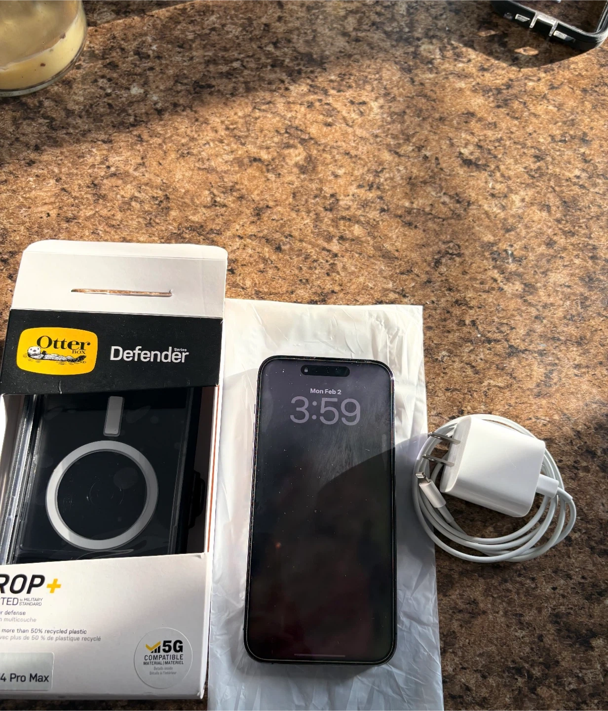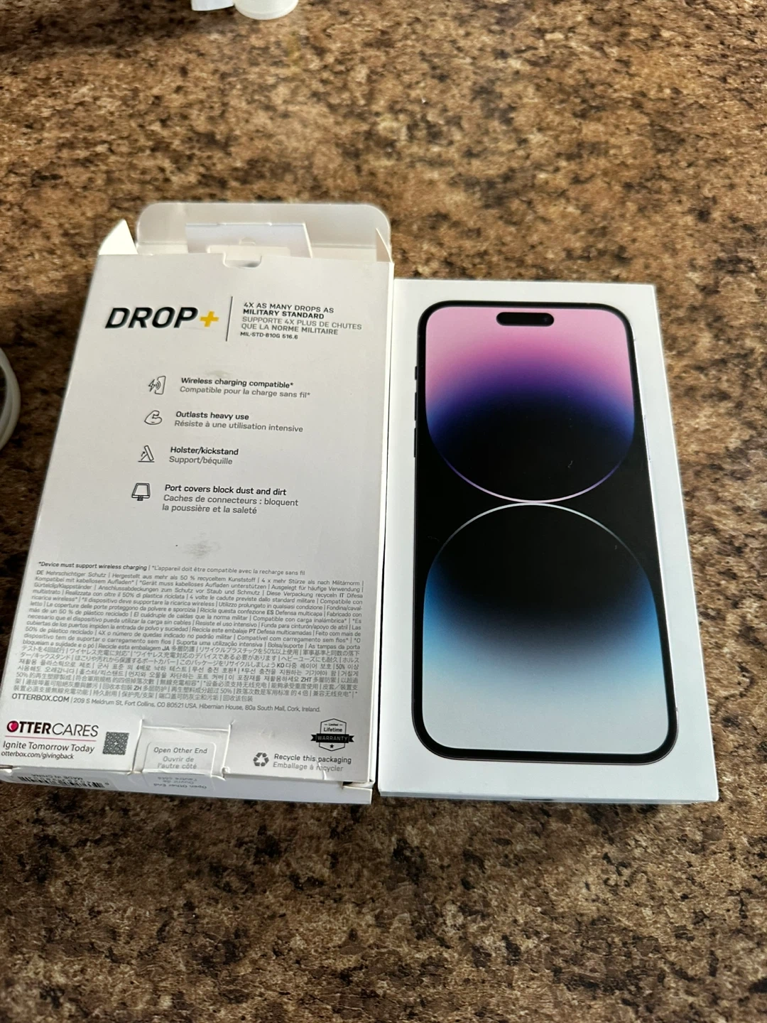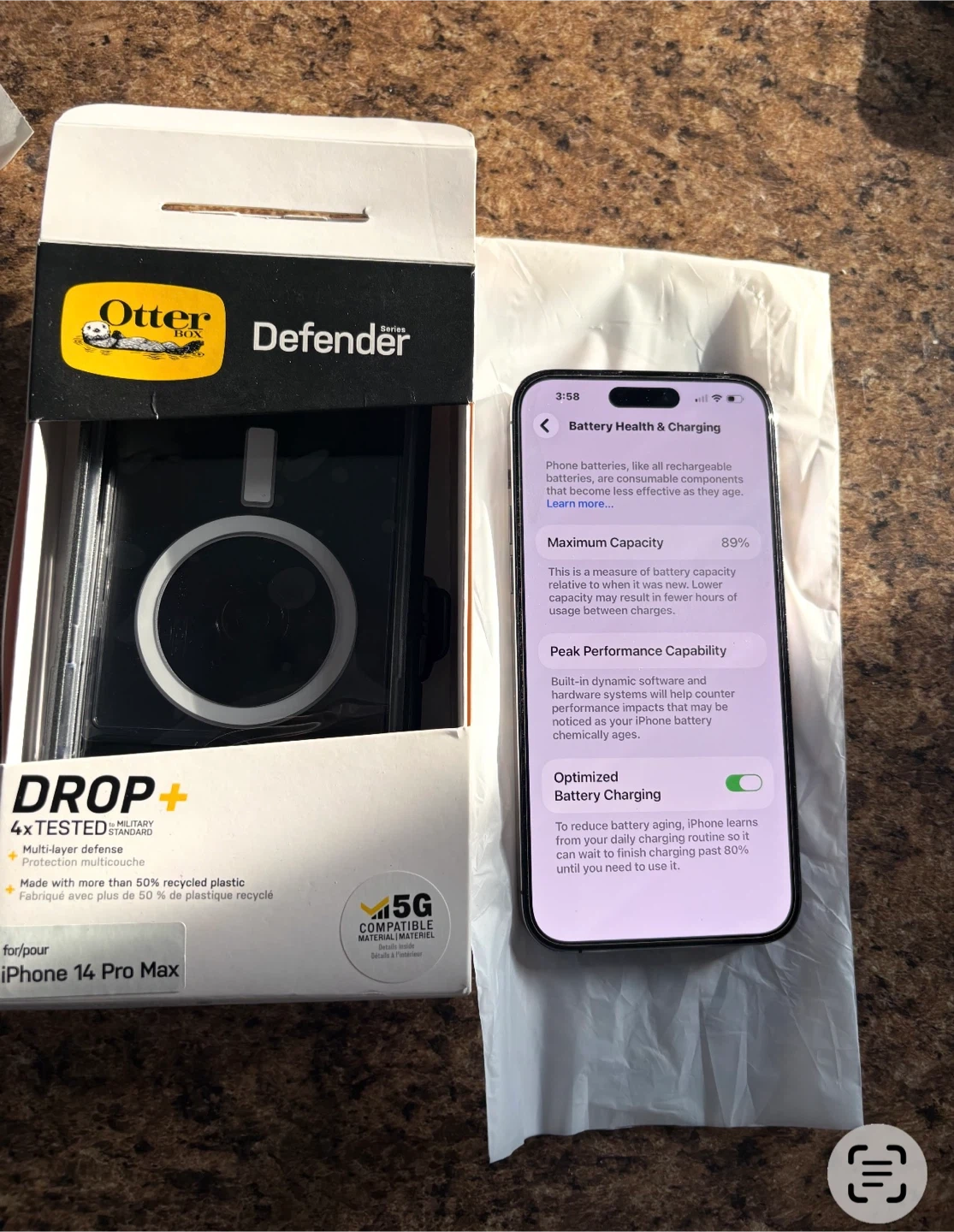 Apple iPhone 14 Pro Max in Deep Purple with 512GB storage. Battery health is at 89%. Includes new OtterBox Defender case and charging brick. This phone's storage is 512GB.