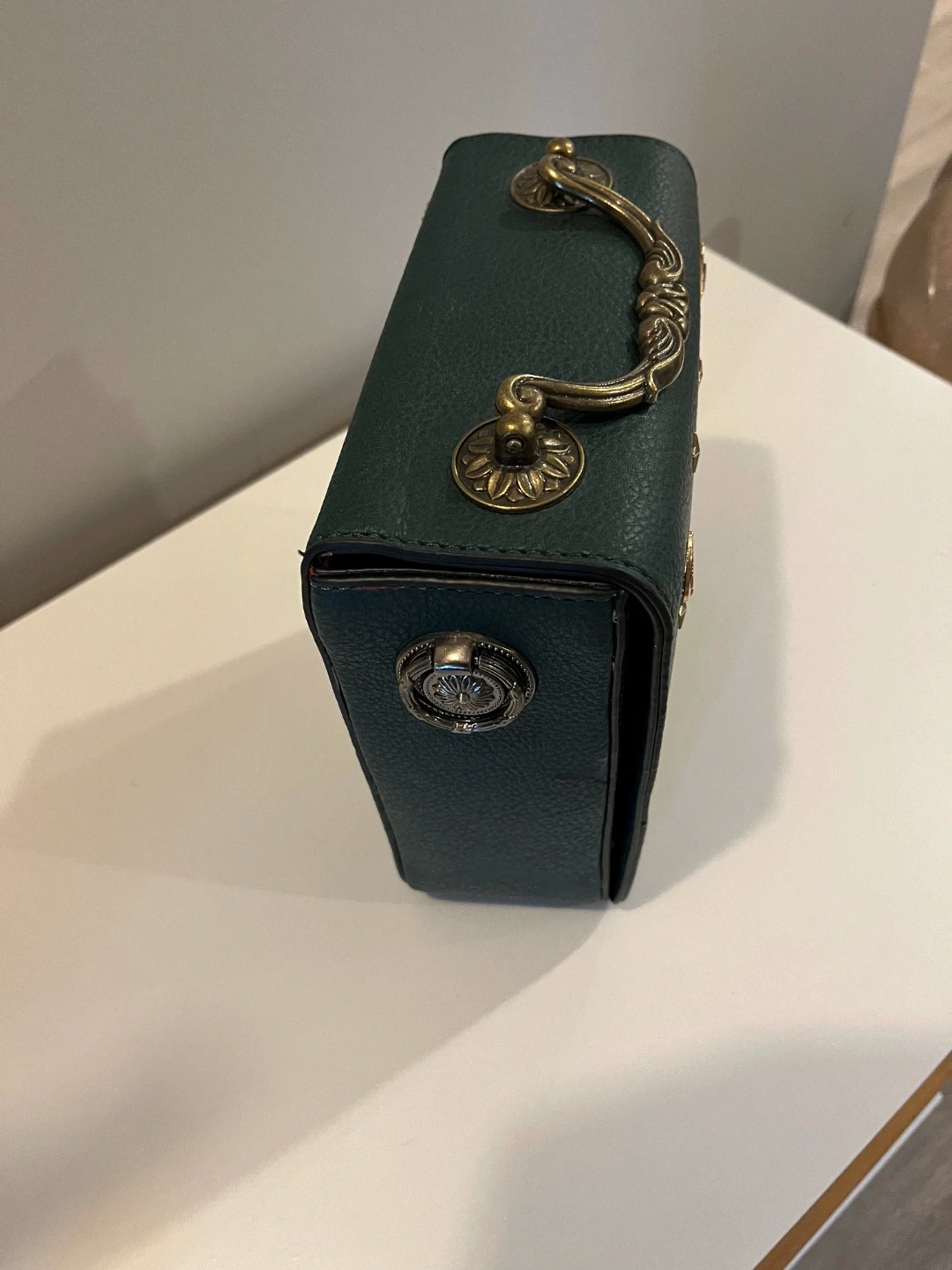 This is a unique dark green handbag with a vintage-inspired clock face design. It features a faux leather exterior and decorative gold hardware, including a top handle and celestial accents. The interior has a zippered pocket and a main compartment.