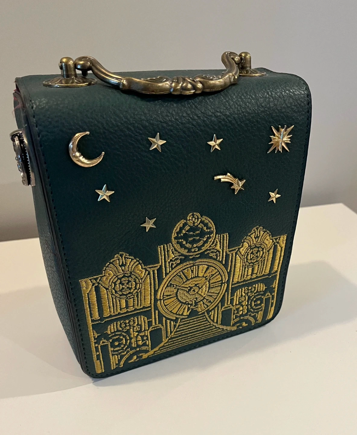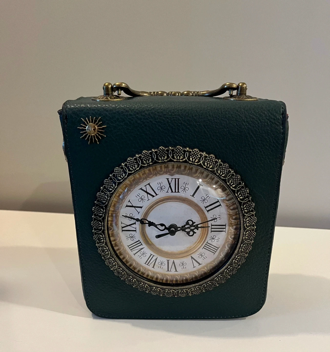 This is a unique dark green handbag with a vintage-inspired clock face design. It features a faux leather exterior and decorative gold hardware, including a top handle and celestial accents. The interior has a zippered pocket and a main compartment.
