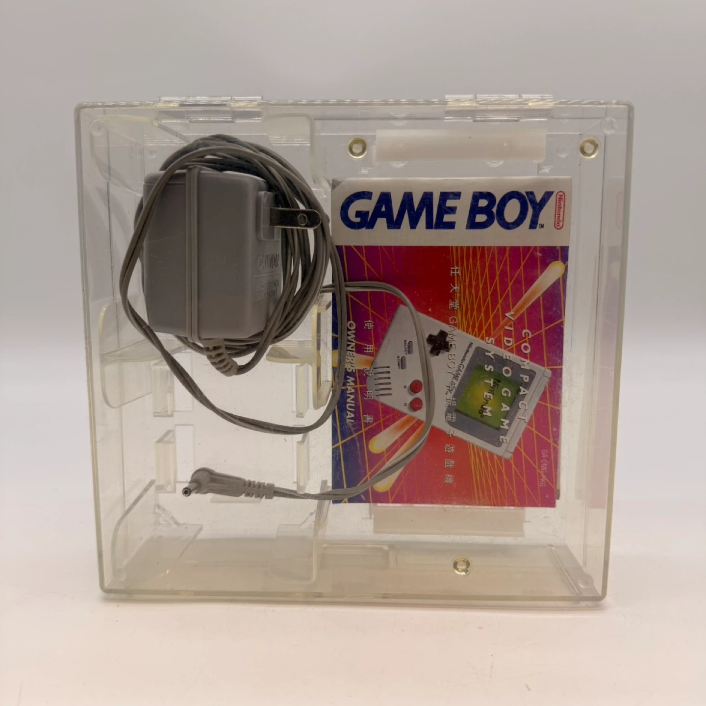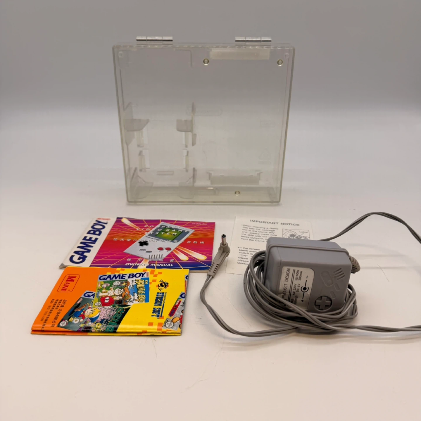 Original Nintendo Game Boy accessory bundle including hard case, power adapter, manuals, and inserts.