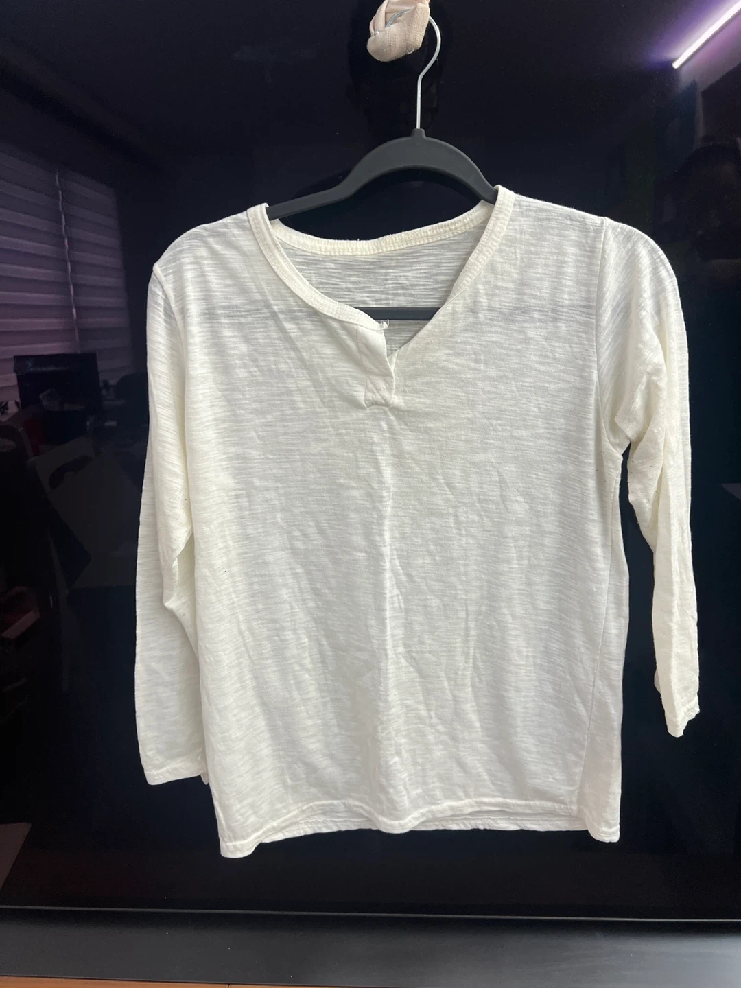 Here's a simple white long-sleeve top that's perfect for layering or wearing on its own! It's in great condition and ready for a new wardrobe