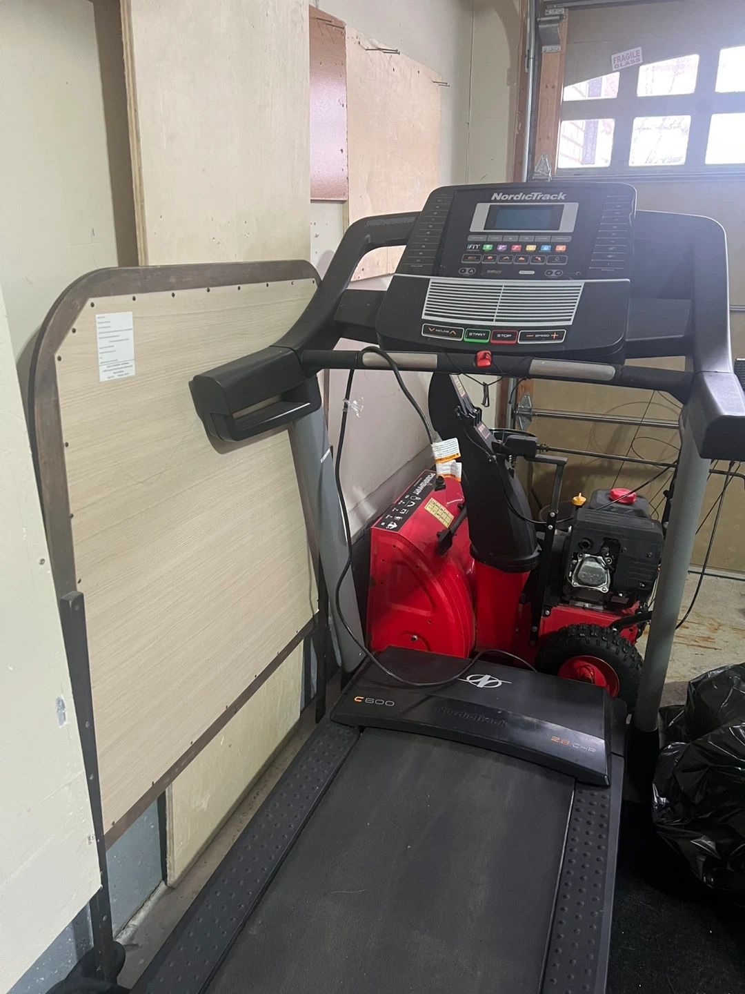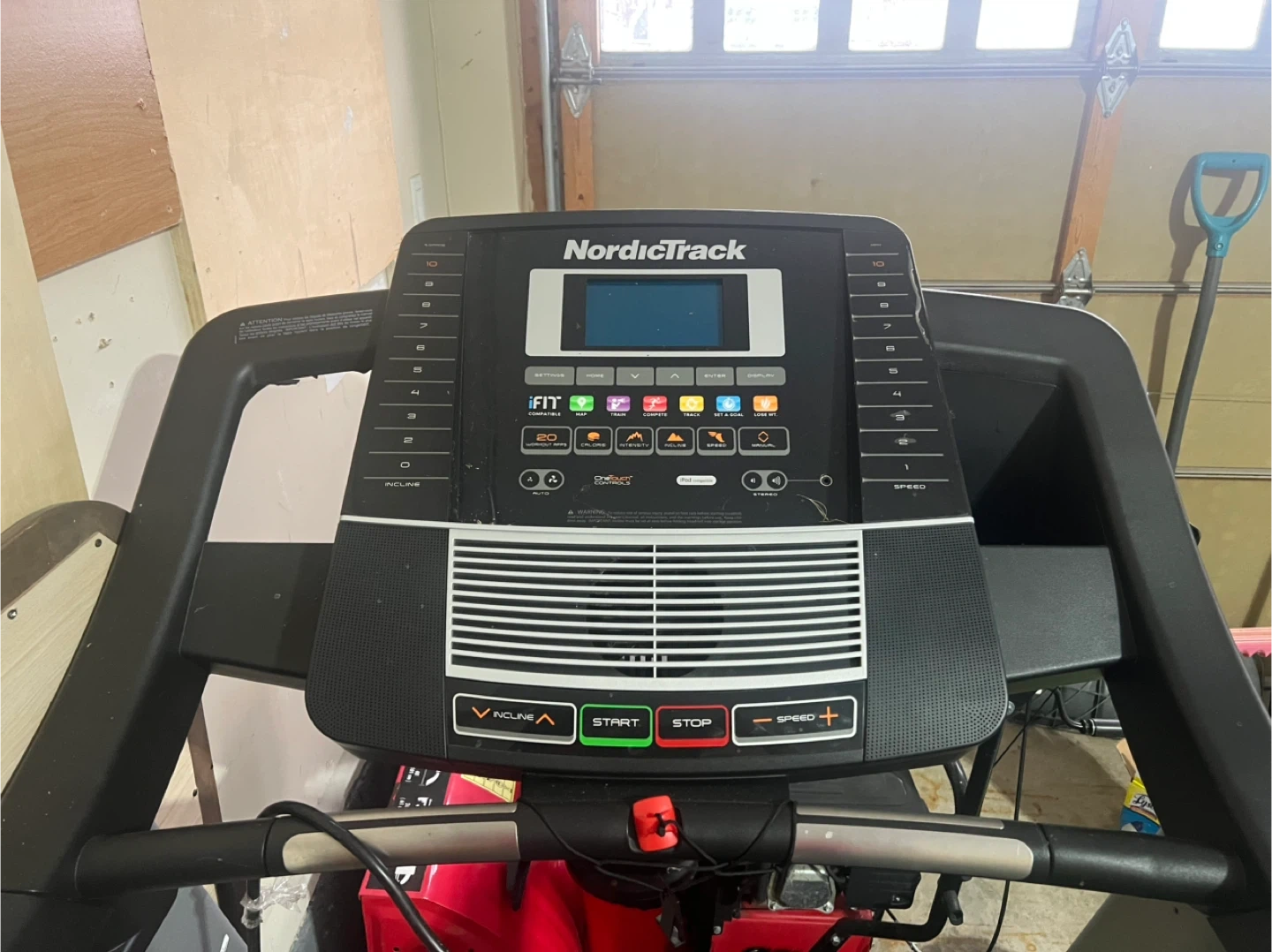 This NordicTrack treadmill has a running surface and adjustable incline. It features pre-programmed workouts and a digital display. Great for home cardio sessions!