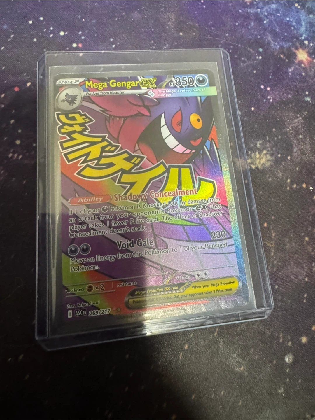 This is a Pokémon TCG Mega Gengar EX card, number 269/217. It has the ability Shadowy Concealment and the attack Void Gale. The card features Mega Gengar EX with 350 HP.