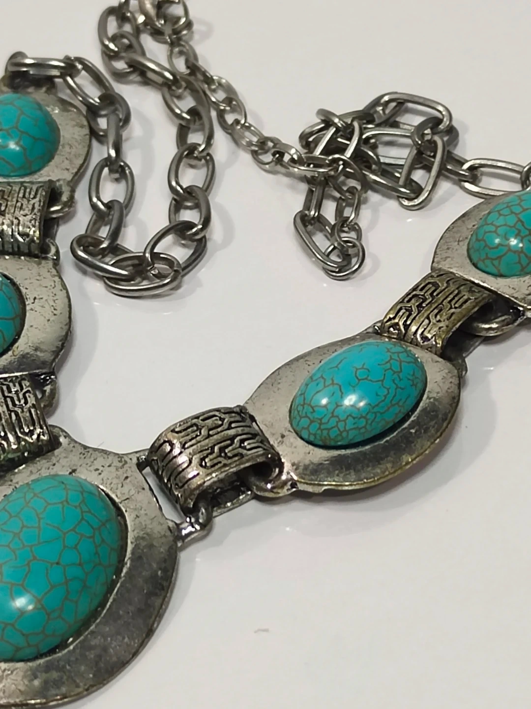 This necklace features a chunky silver-tone chain with five oval turquoise-coloured stones. The stones are set in ornate silver-tone metal links. It's a statement piece with a boho-chic vibe. It adds a pop of colour to any outfit!