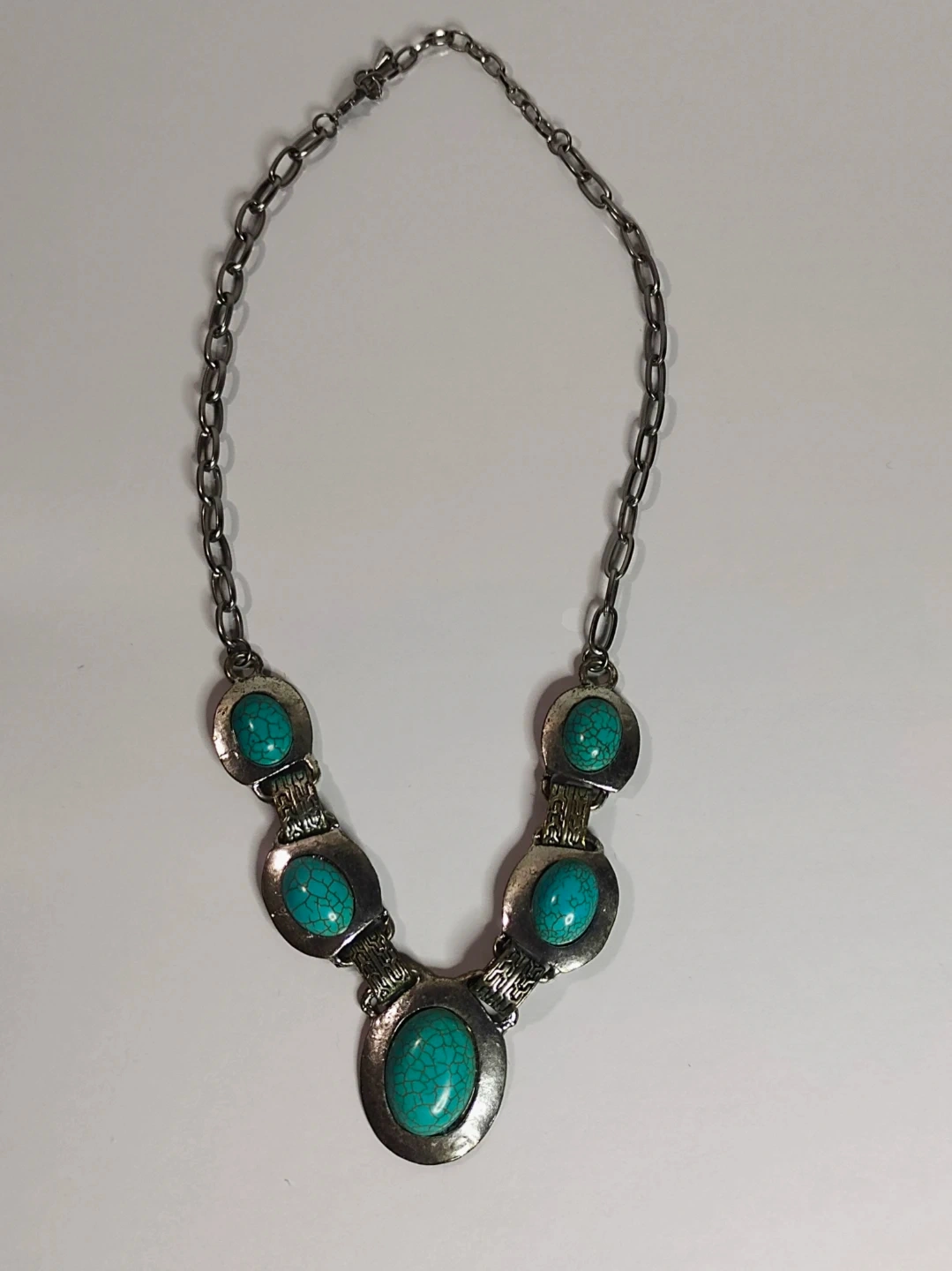This necklace features a chunky silver-tone chain with five oval turquoise-coloured stones. The stones are set in ornate silver-tone metal links. It's a statement piece with a boho-chic vibe. It adds a pop of colour to any outfit!