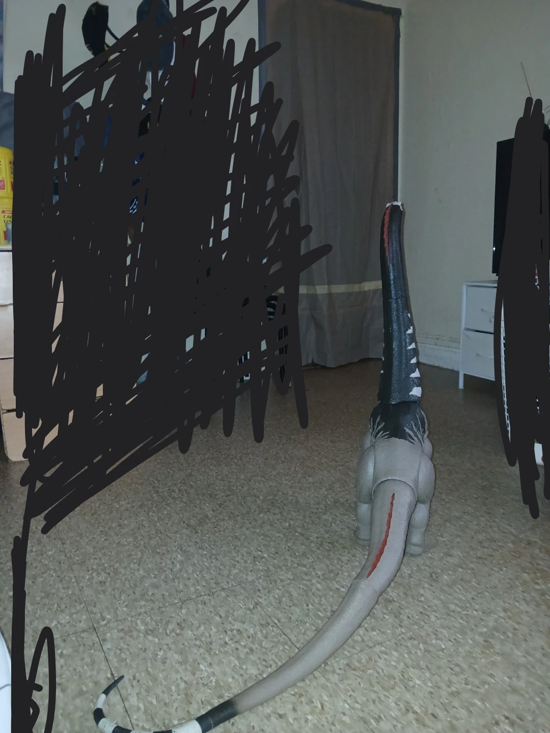This is a large Jurassic World Brachiosaurus dinosaur toy. It's made of plastic and has a movable neck and tail. The coloring is grey with black and white accents and orange frills.