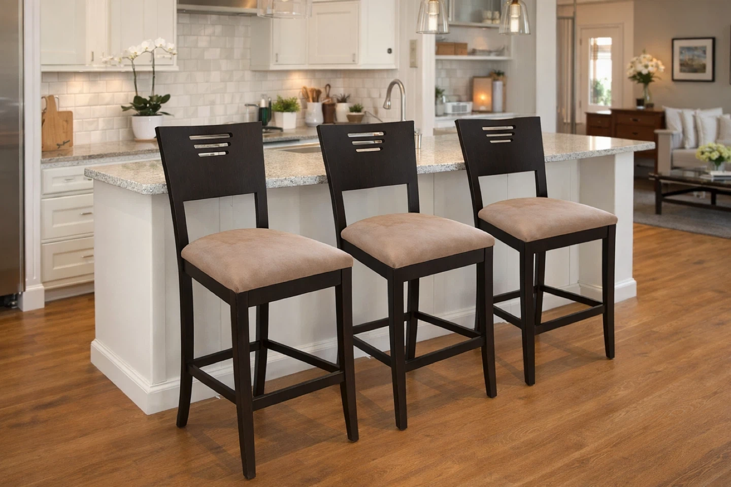 Three dark brown bar stools featuring comfortable beige upholstered seats. The backs have a simple, modern design with horizontal slats. These stools are perfect for a kitchen island or bar area.