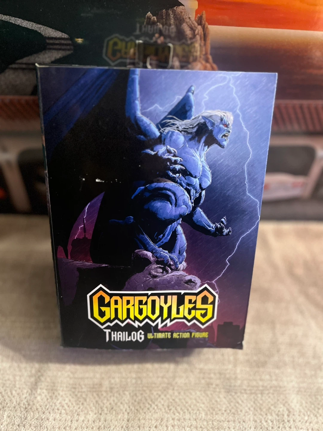 This NECA action figure depicts Thailog from the Gargoyles series. It's an ultimate edition figure with included accessories. The packaging is designed to showcase the collectible.