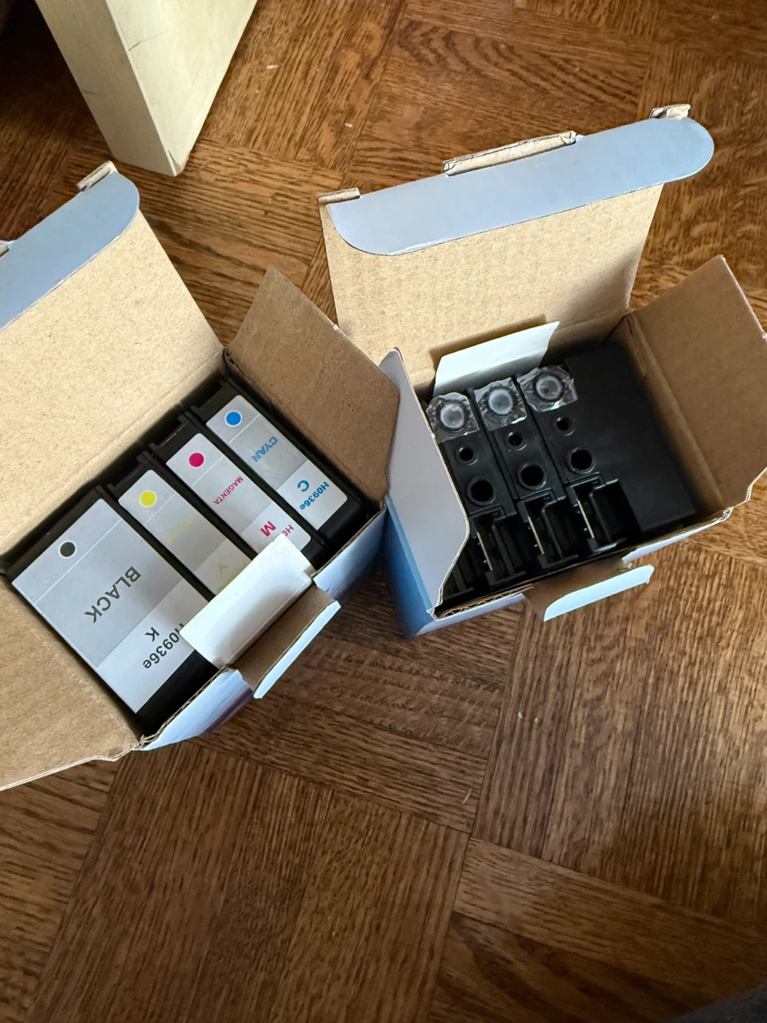 These are replacement ink cartridges for HP OfficeJet printers. The set includes black, cyan, magenta, and yellow cartridges. They're compatible with various HP OfficeJet models including 9110, 9110b, 9120, 9120b, 9130, 9130b, 9135e, 9730, and 9730e. Print quality is important for your documents!