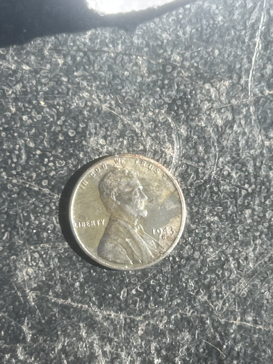 This is a 1943 United States one cent coin, also known as a penny. It's made of steel, not copper, due to wartime metal conservation. This coin was minted in 1943.