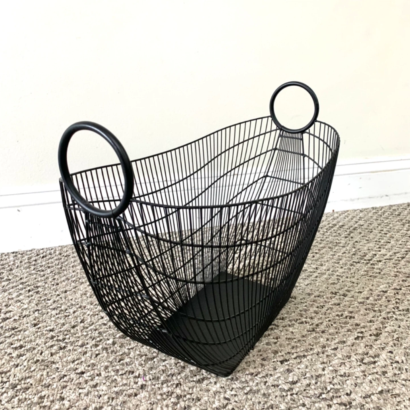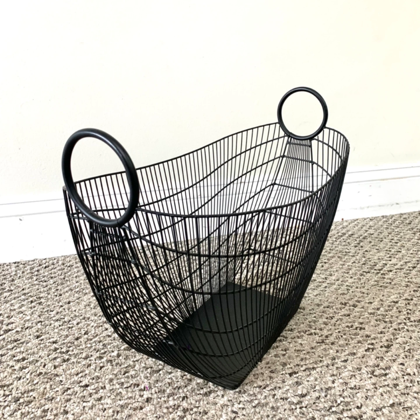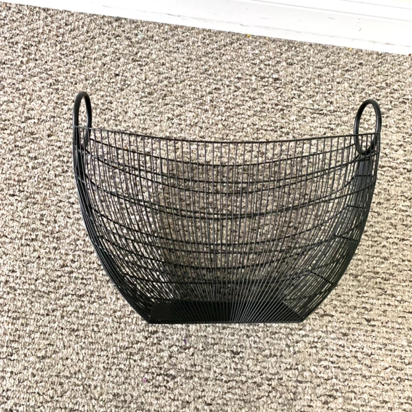 This is a black wire storage basket. It's made of metal wire with round handles on each side. The base is solid black metal. It's a handy size for storing items.