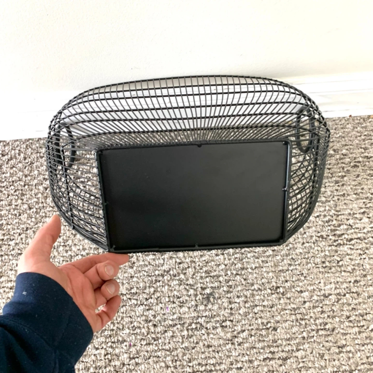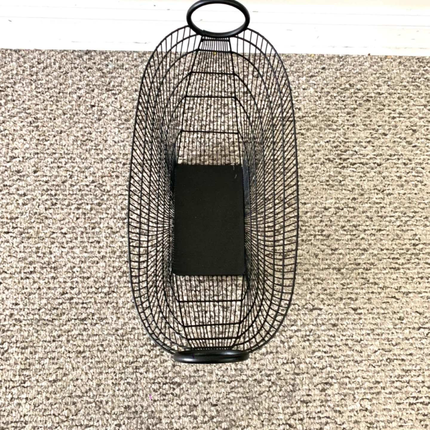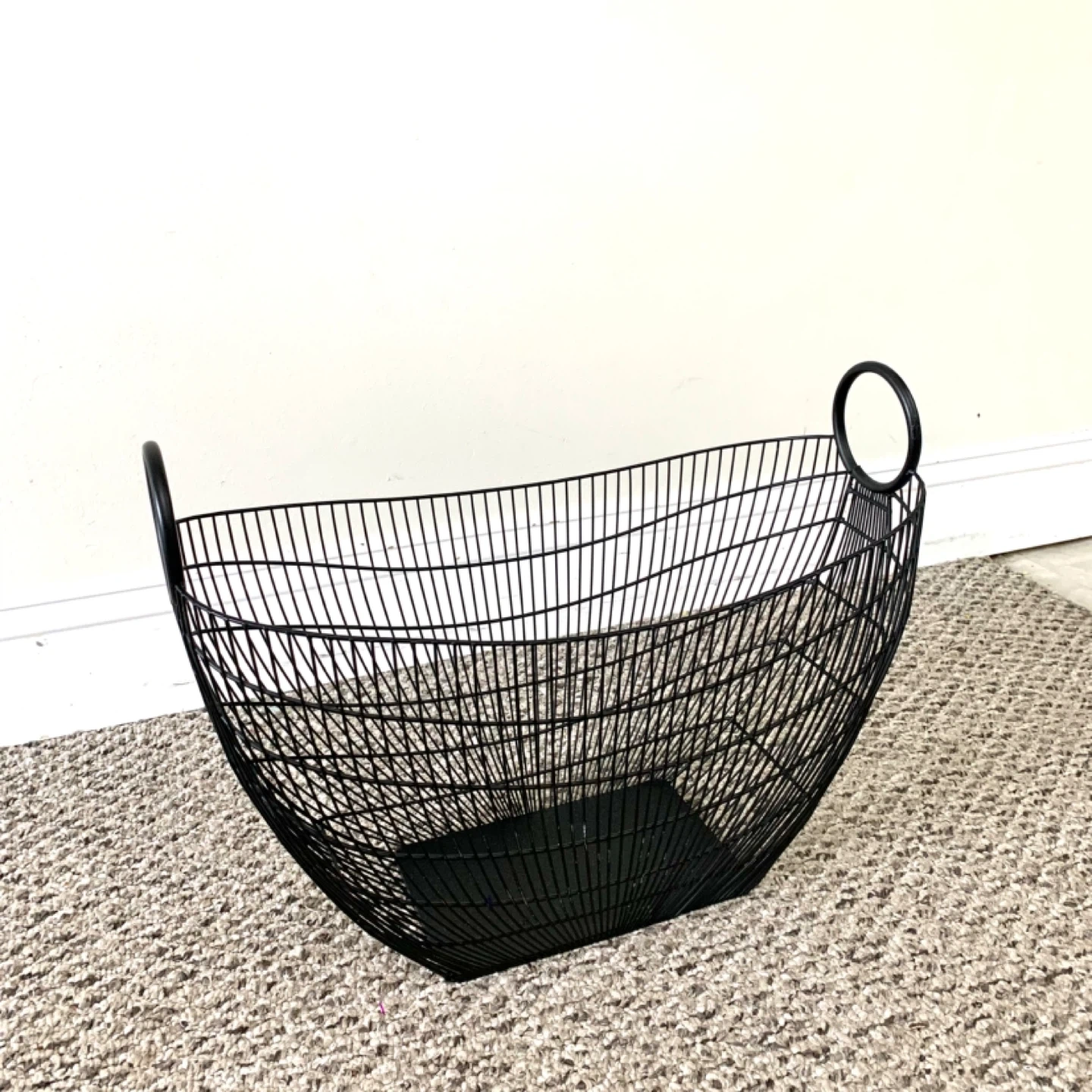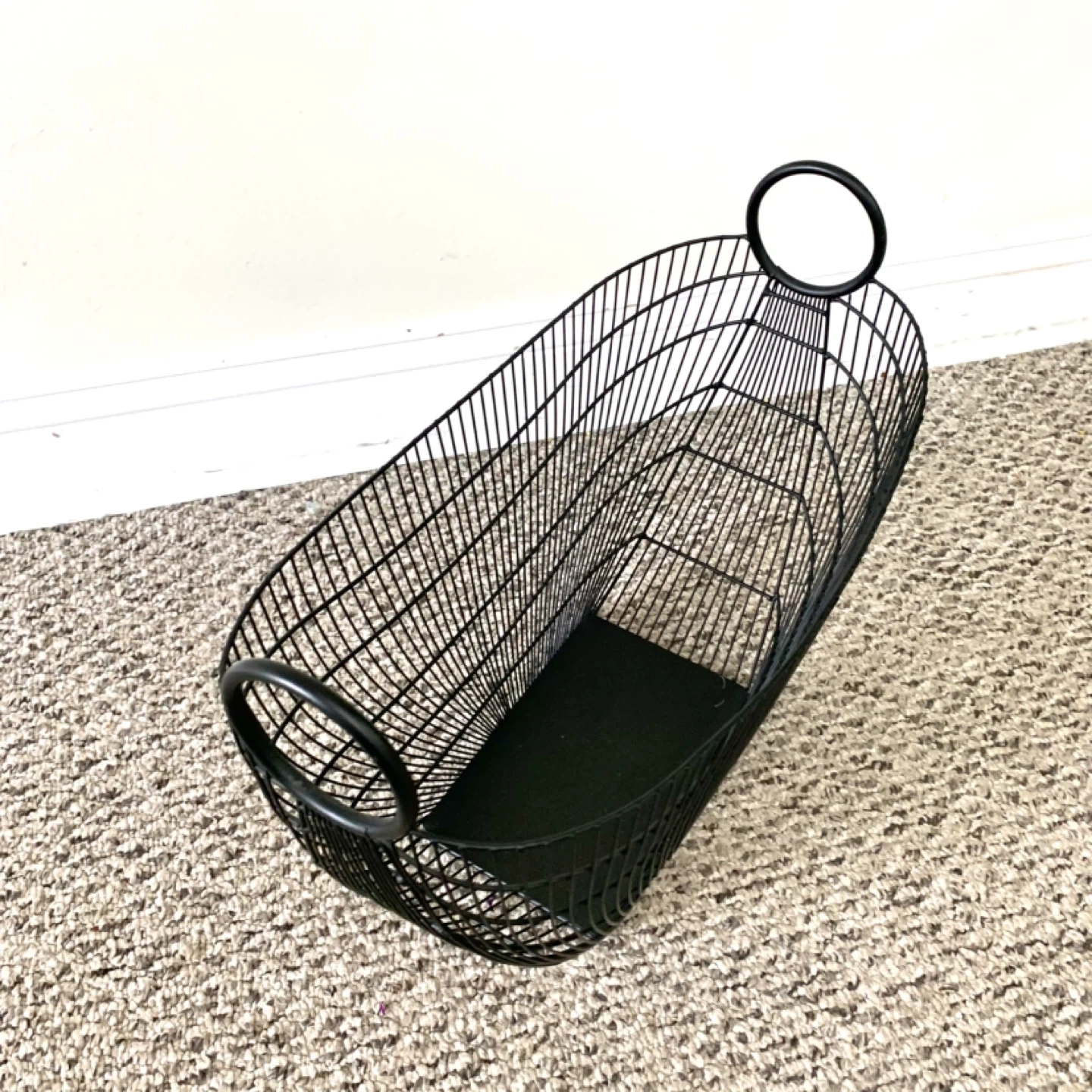 This is a black wire storage basket. It's made of metal wire with round handles on each side. The base is solid black metal. It's a handy size for storing items.