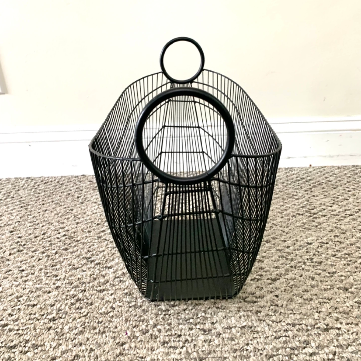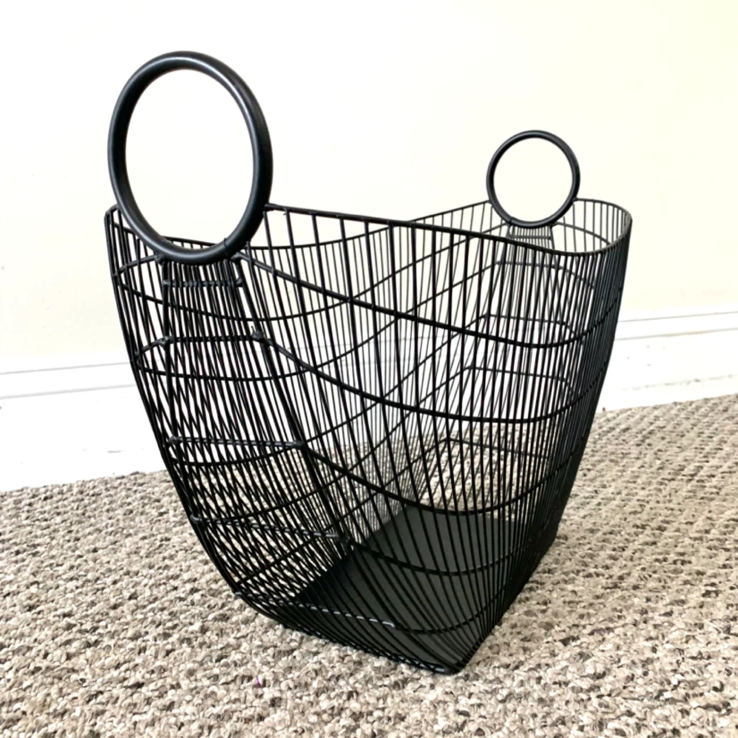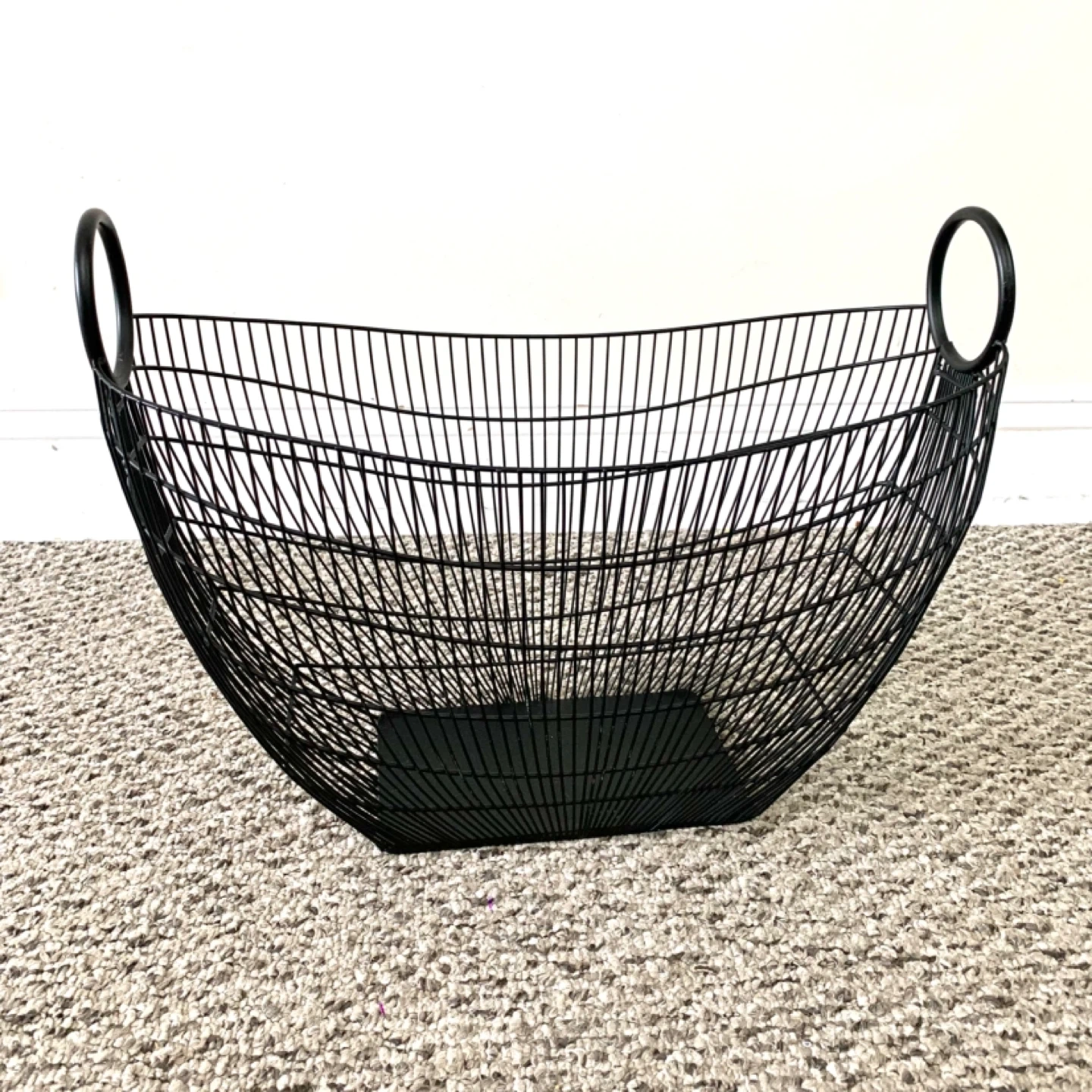 This is a black wire storage basket. It's made of metal wire with round handles on each side. The base is solid black metal. It's a handy size for storing items.