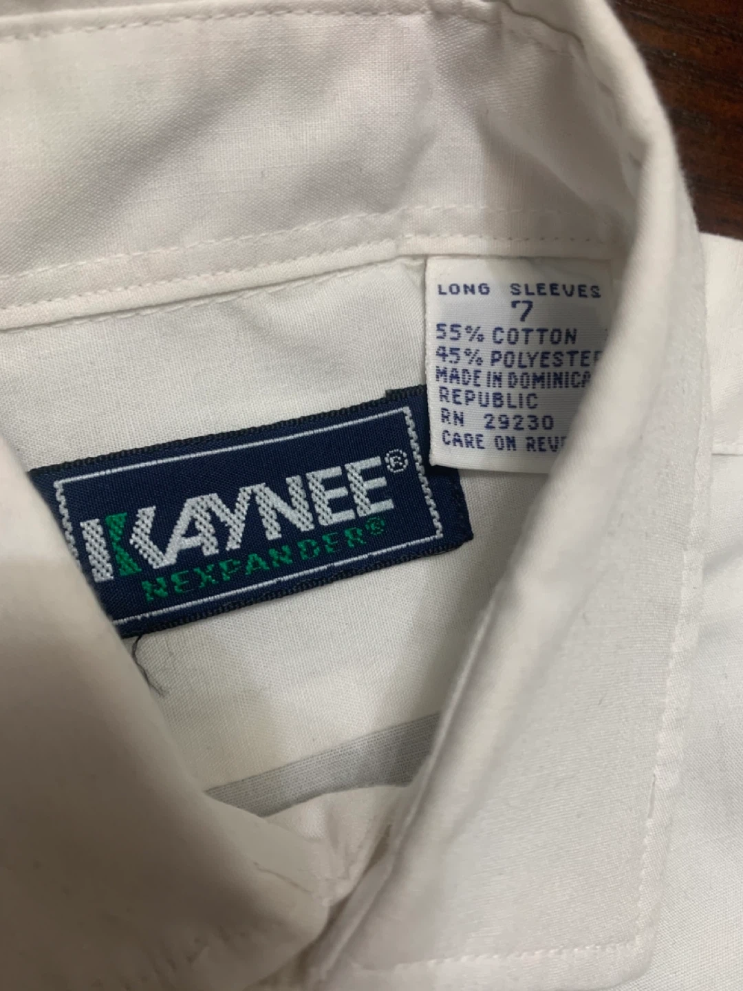 Selling a Kaynee Nexpander long-sleeved shirt in white, size 7. It's made of 55% cotton and 45% polyester.