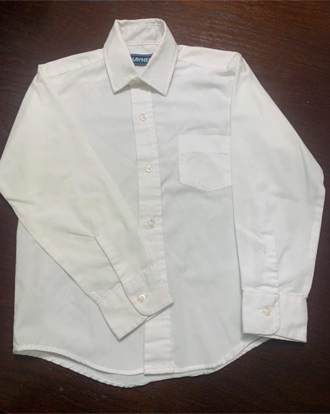 Selling a Kaynee Nexpander long-sleeved shirt in white, size 7. It's made of 55% cotton and 45% polyester.