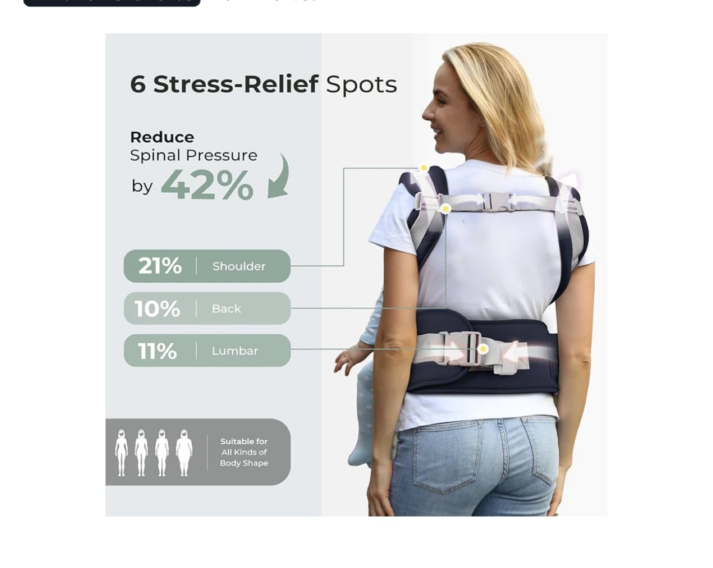 Check out this FRUITEAM baby carrier! It features two styles in one, making it super versatile as your little one grows. Designed to meet all stages of baby's growth, it also has 6 stress-relief spots to reduce spinal pressure by 42%. It distributes weight effectively with 21% on the shoulders, 10% on the back, and 11% on the lumbar region. Suitable for all kinds of body shapes!