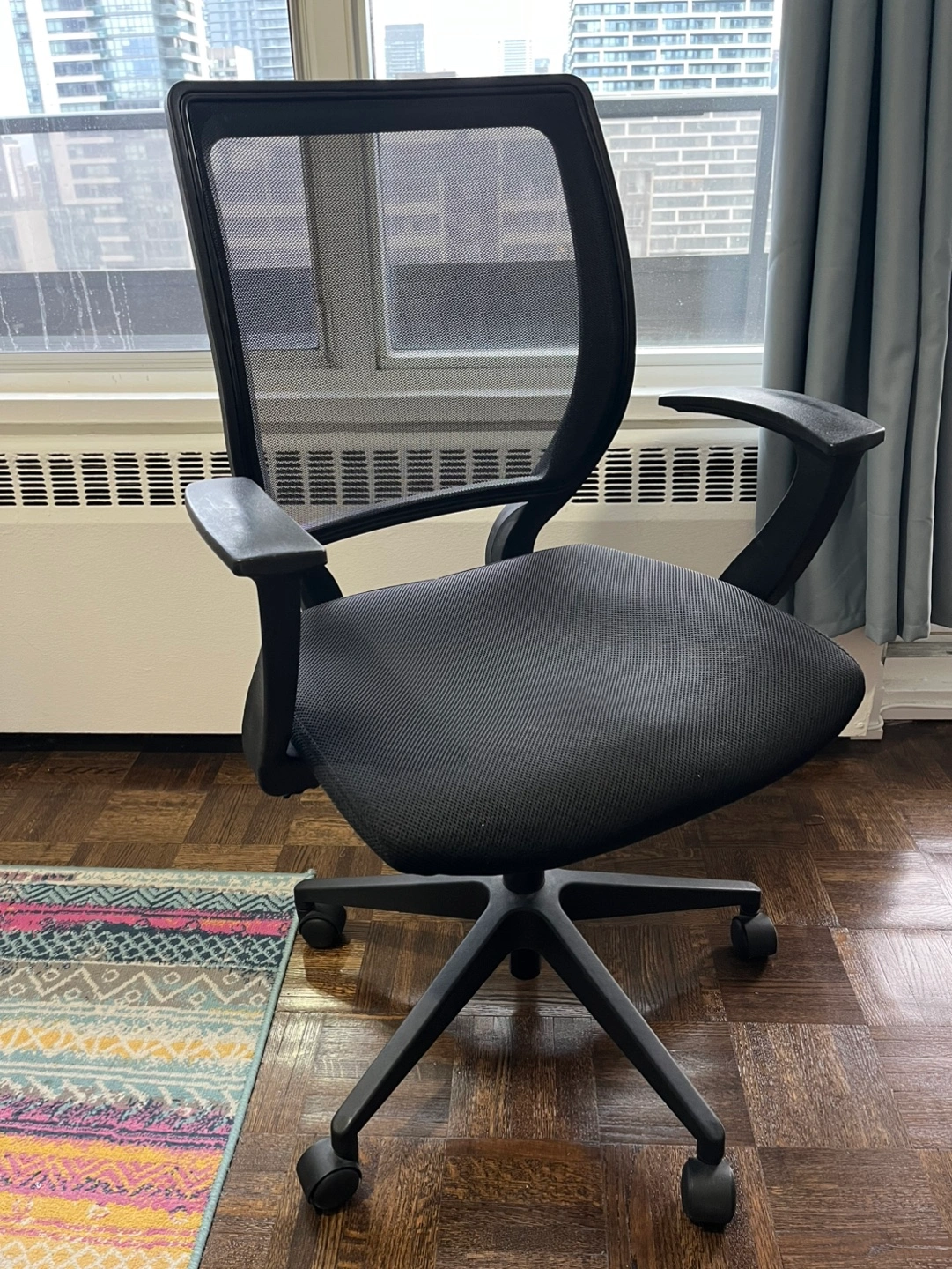 Office chair, mesh back, black fabric seat. Features adjustable height only. Five rolling casters. Great condition.