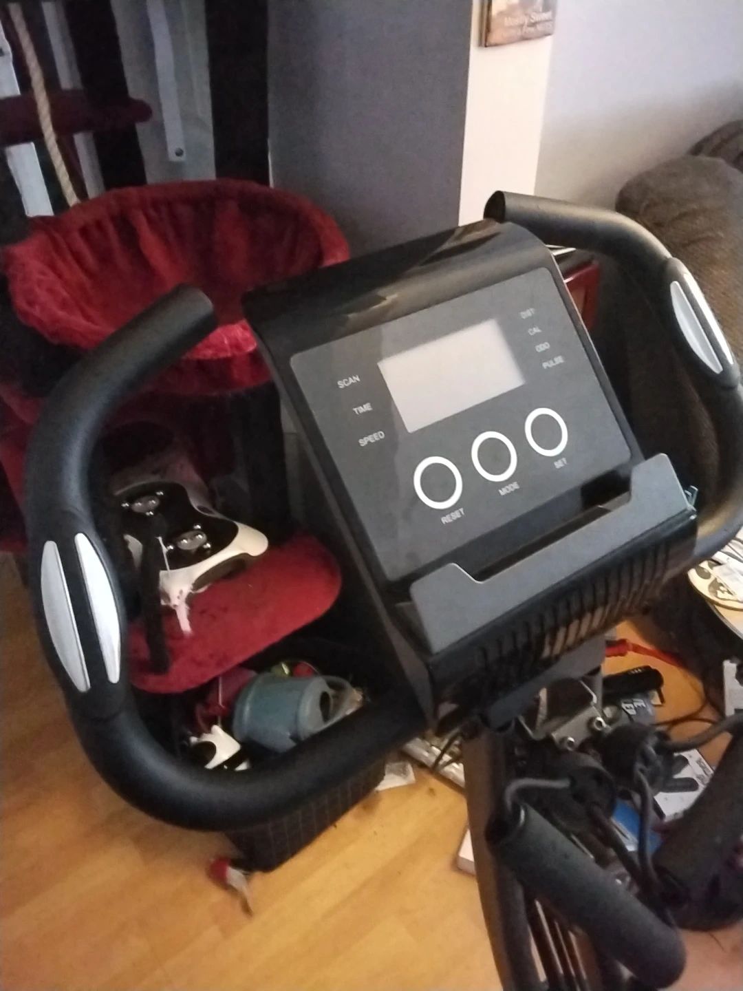 This stationary exercise bike features an adjustable seat and handlebars. It has a digital display showing scan, time, speed, distance, and pulse. Perfect for home workouts!
