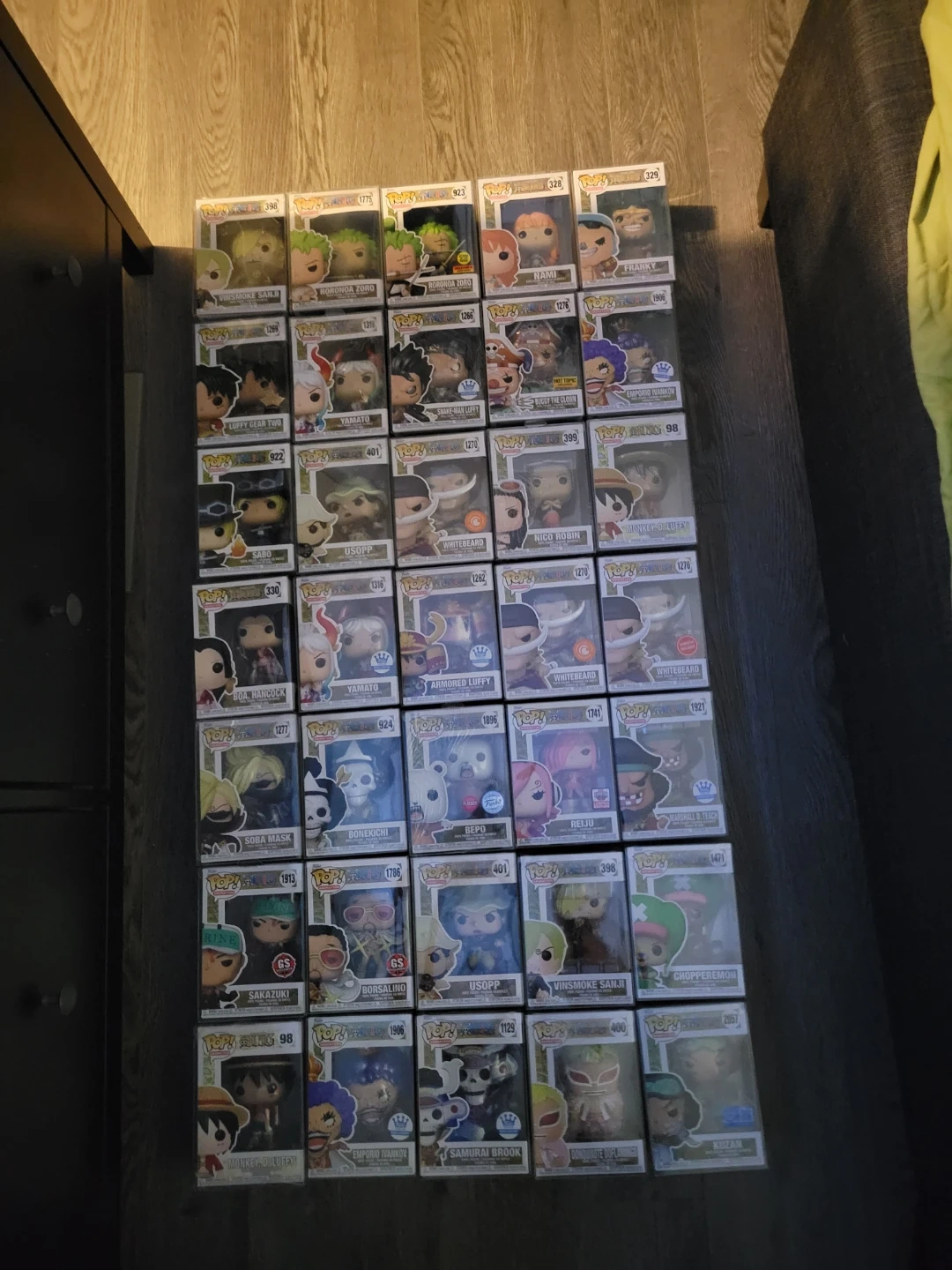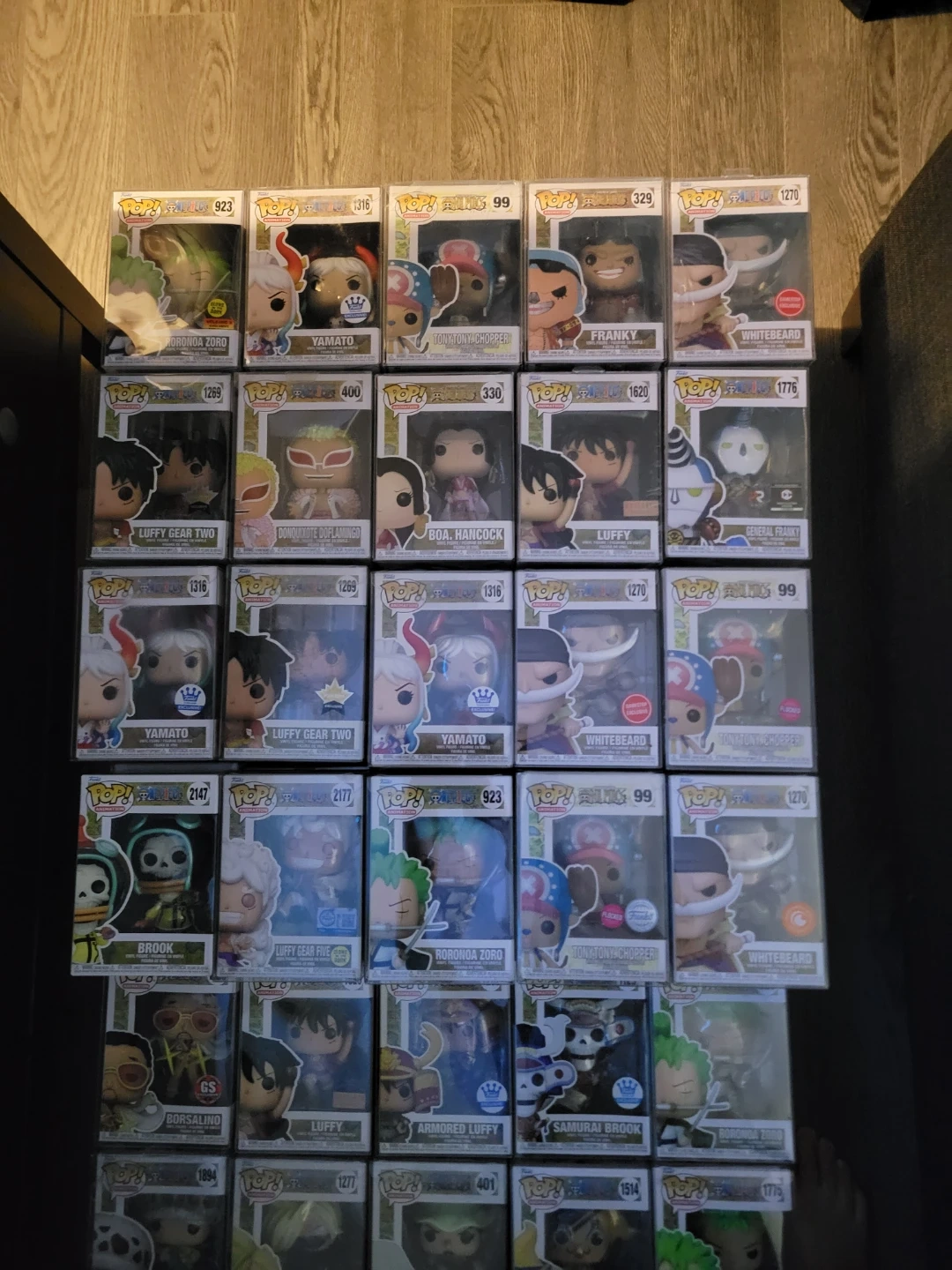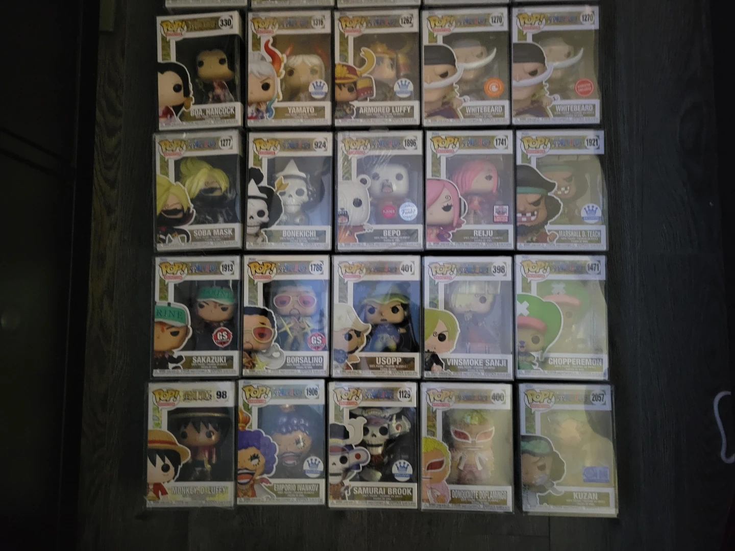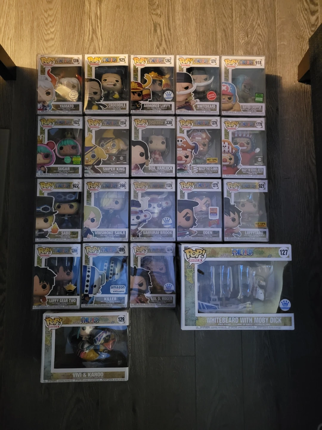 Awesome collection of Funko Pop! vinyl figures from the popular anime series One Piece. These collectible figures are in their original boxes and showcase various iconic characters. Perfect for any One Piece fan's display!
