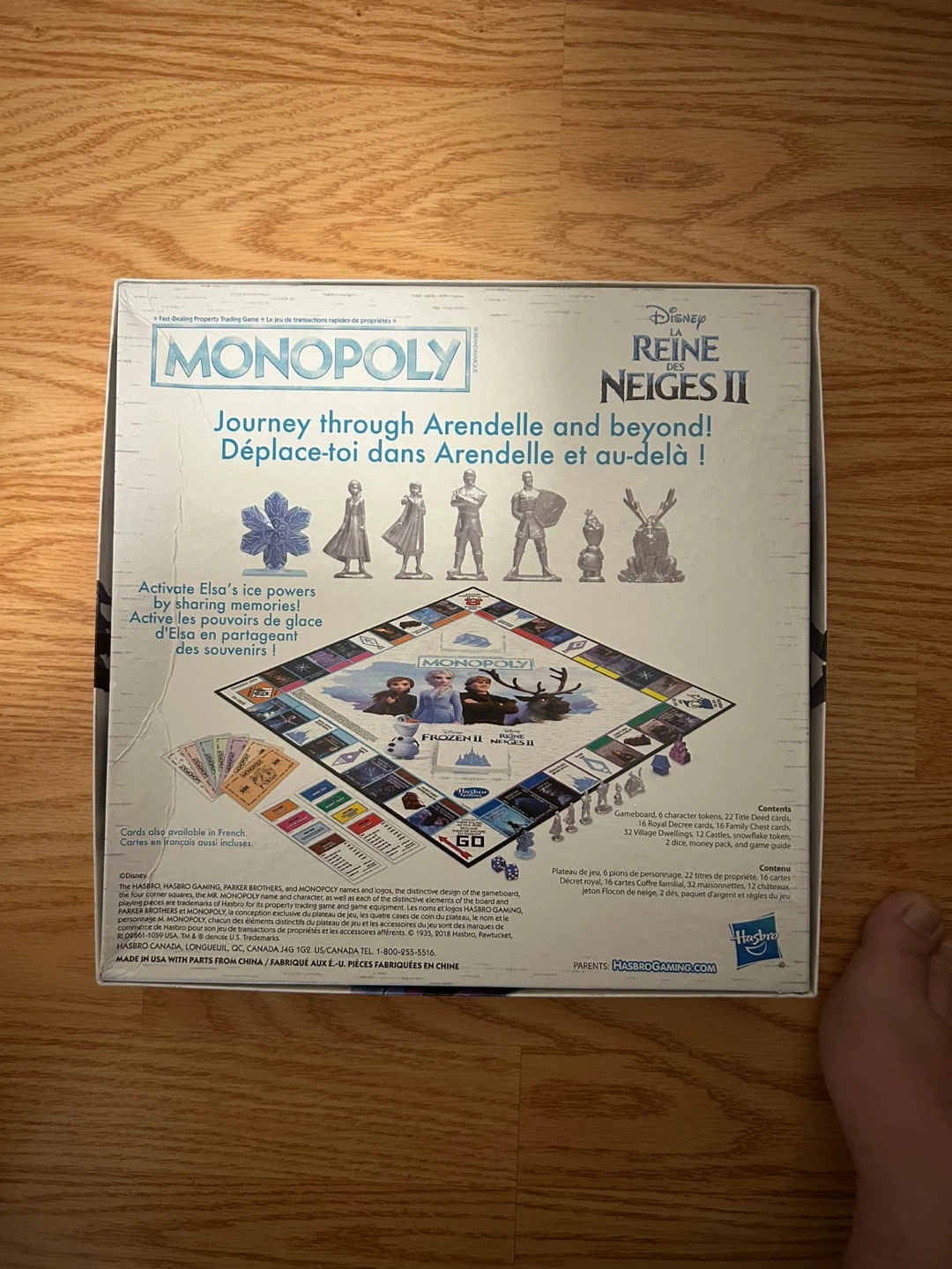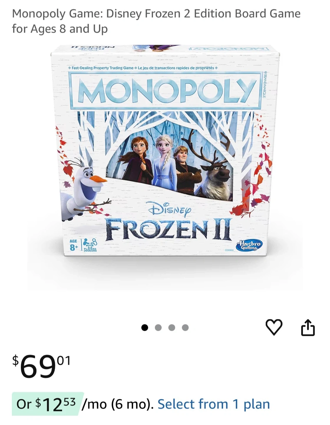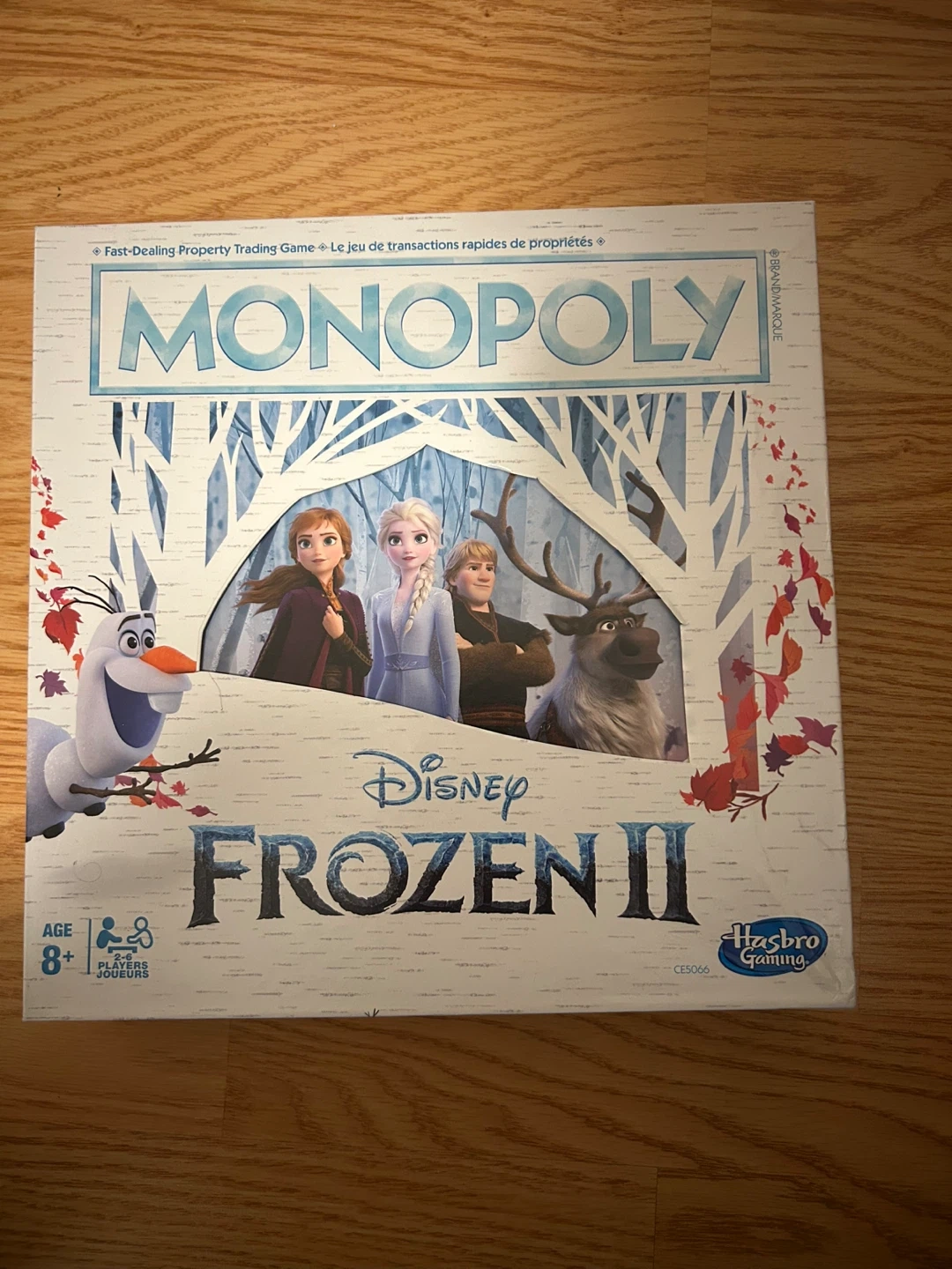 It's the classic Monopoly game with a Frozen 2 theme. This edition is suitable for ages 8 and up. Playable for 2-6 players.
