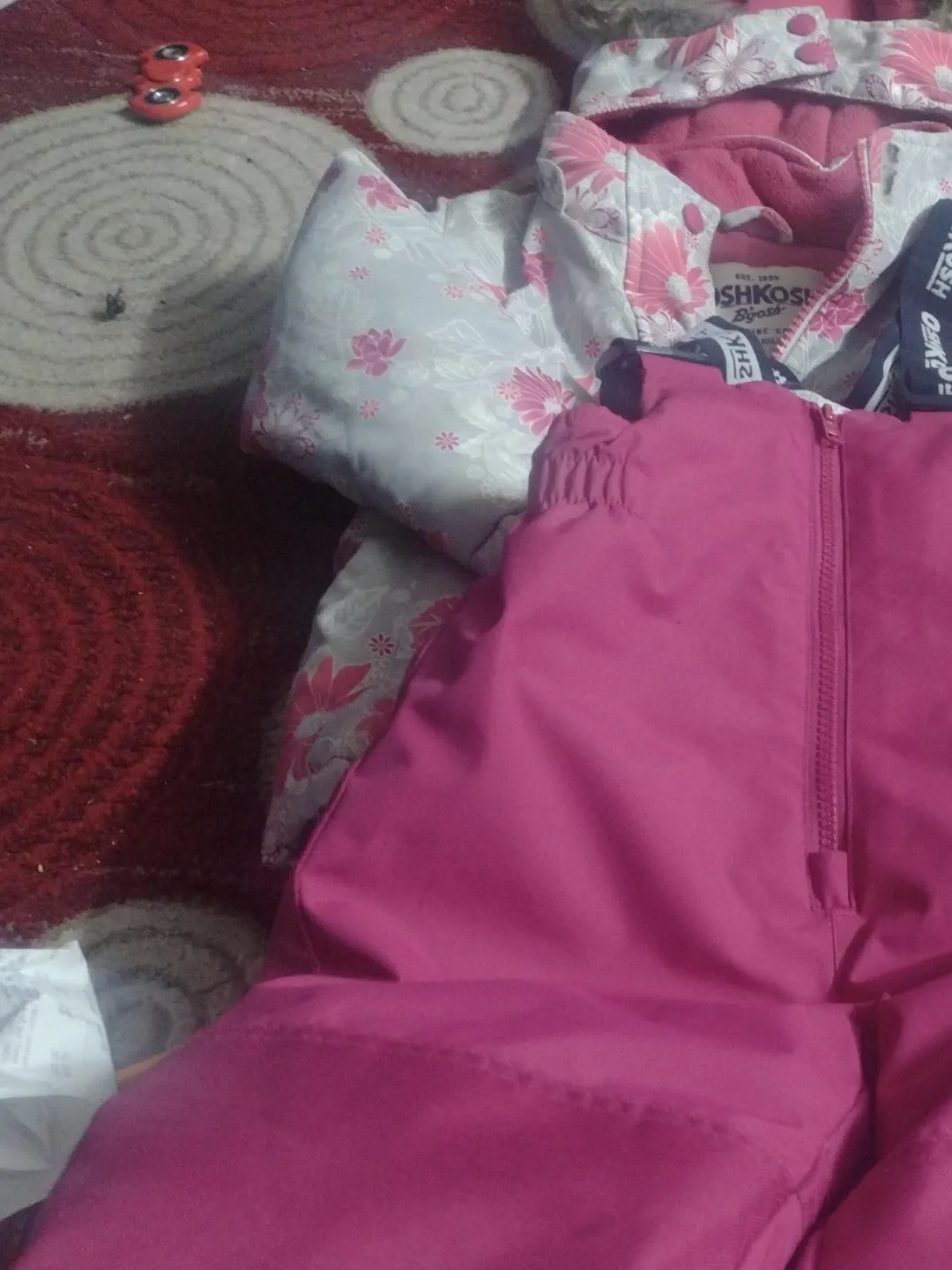 This is a pink OshKosh B'gosh winter jacket with a floral pattern. It's insulated and has a full zipper closure. Great for keeping warm on chilly days!