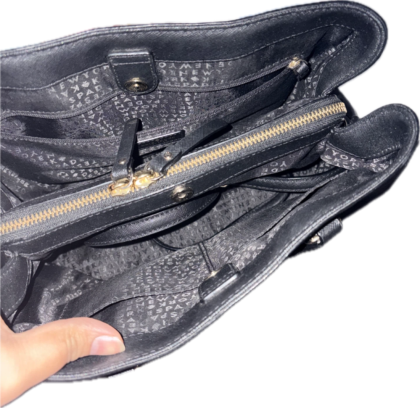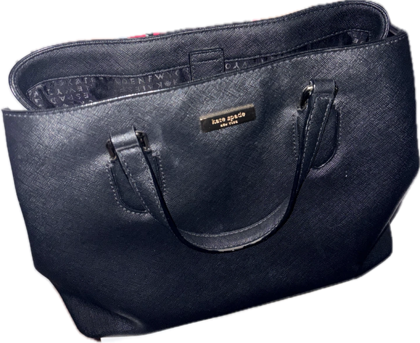 A black Kate Spade tote bag made of crosshatch leather. It features a zip-top closure and multiple interior pockets for organization. This bag's classic design makes it suitable for everyday use.
