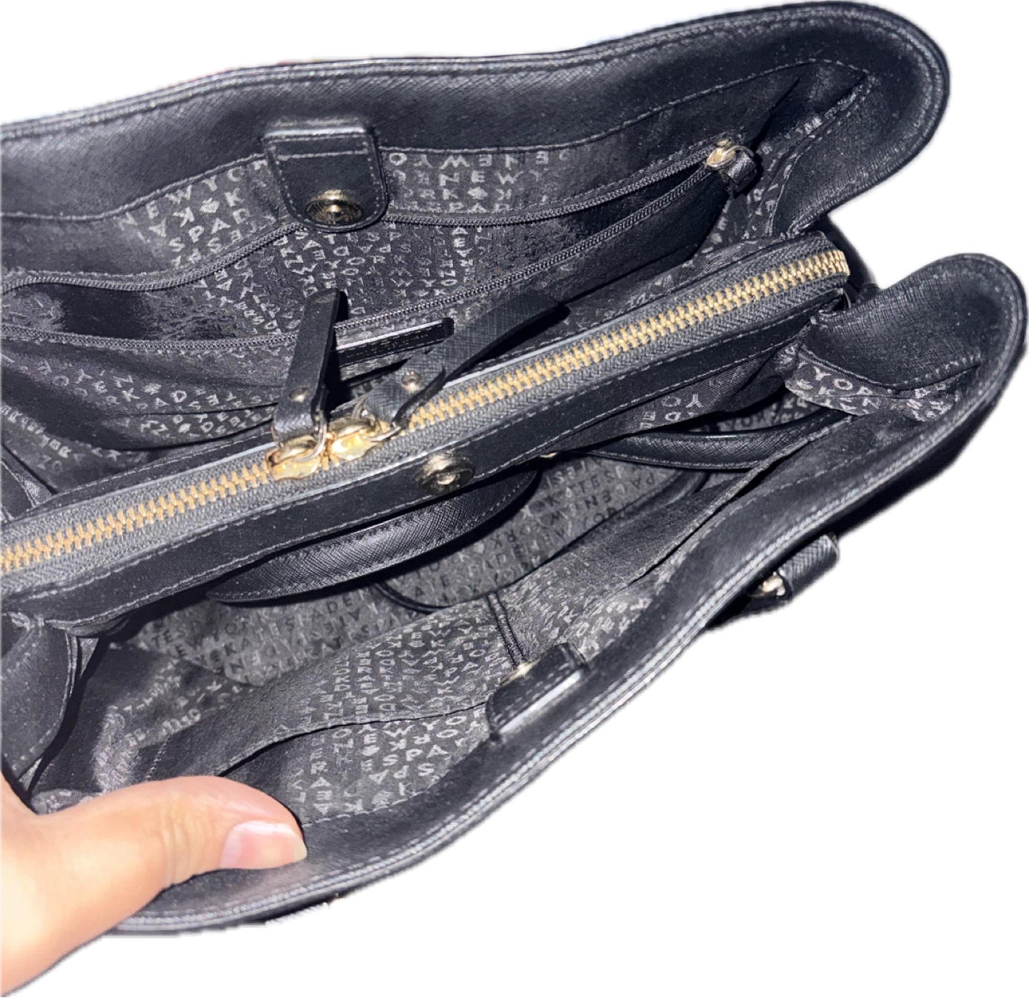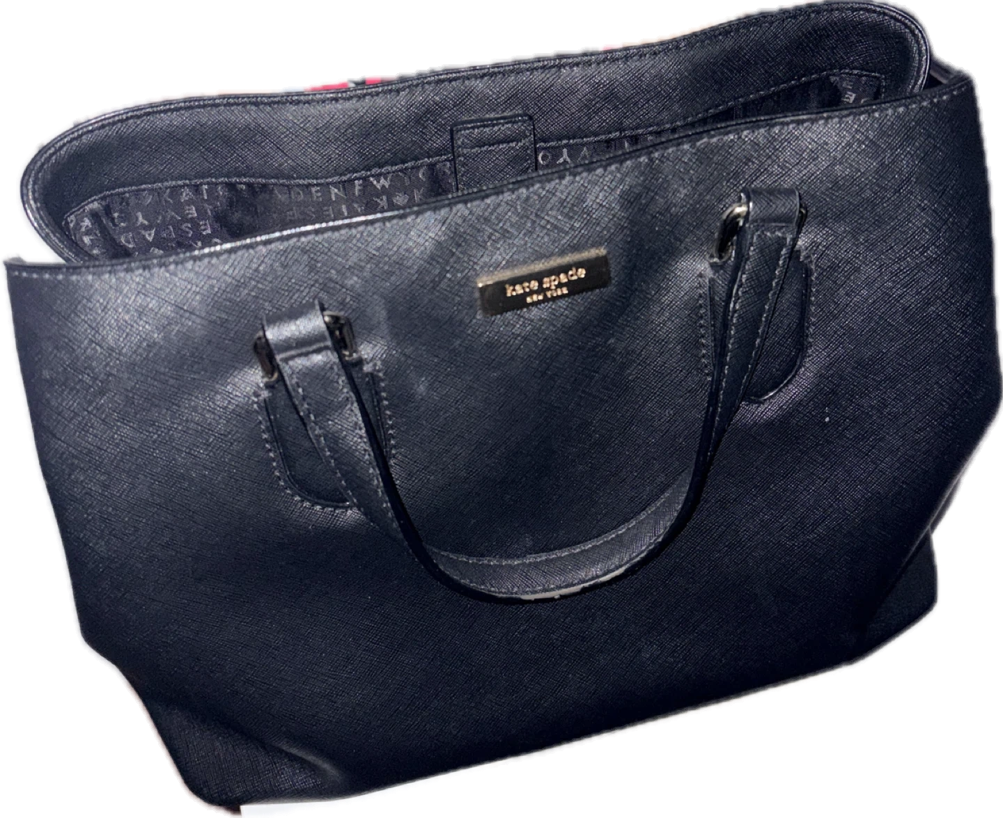 A black Kate Spade tote bag made of crosshatch leather. It features a zip-top closure and multiple interior pockets for organization. This bag's classic design makes it suitable for everyday use.