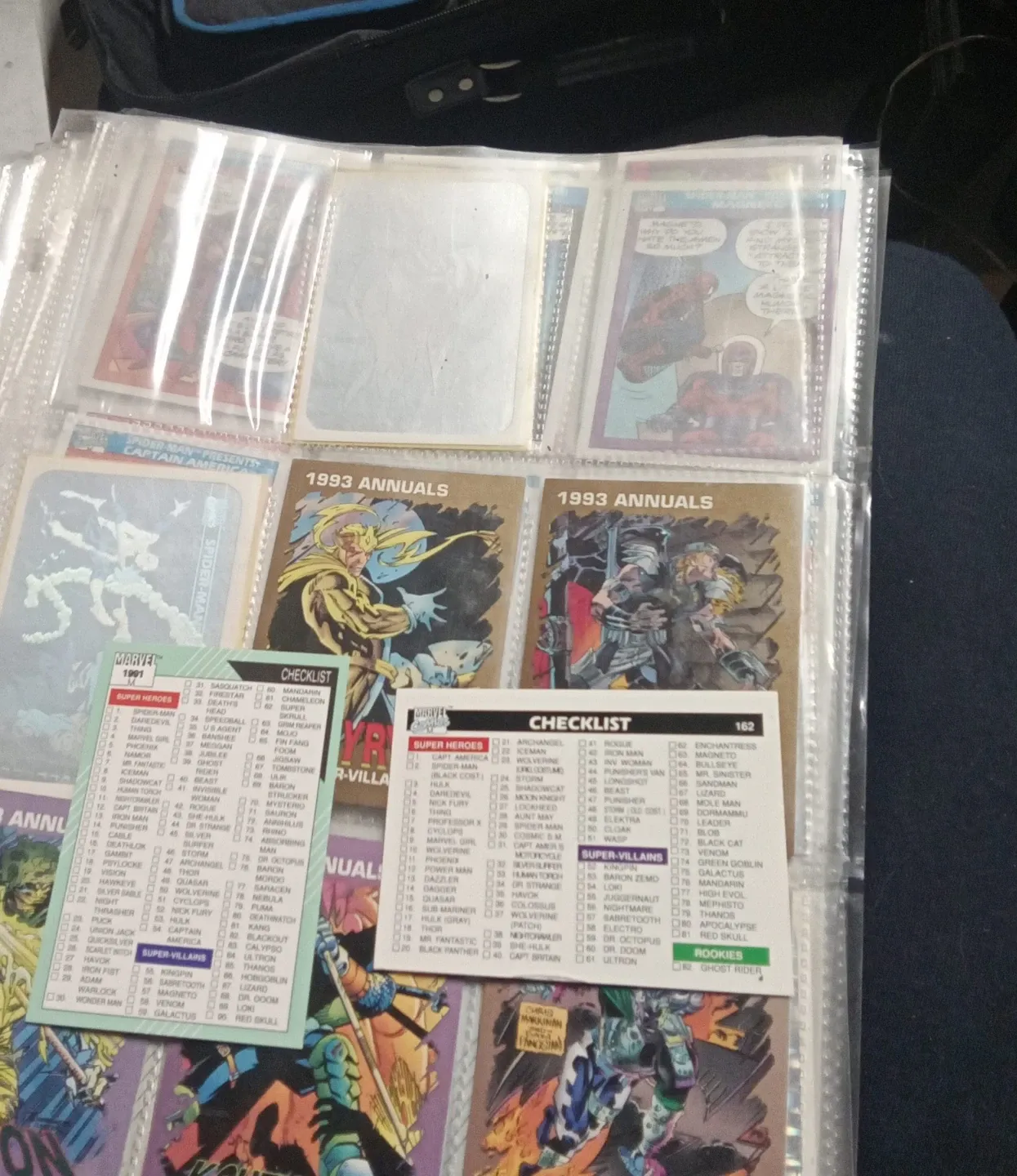 Collection of Marvel trading cards from 1991 and 1993 Annuals issues. Includes checklists for Super Heroes and Super Villains. Cards feature various characters like Spider-Man, Captain America, and others.