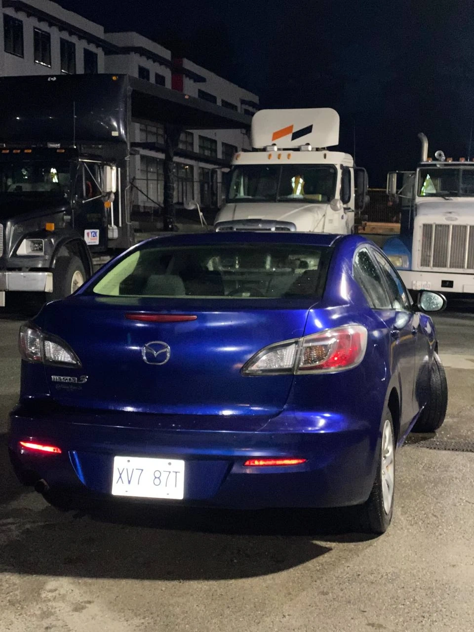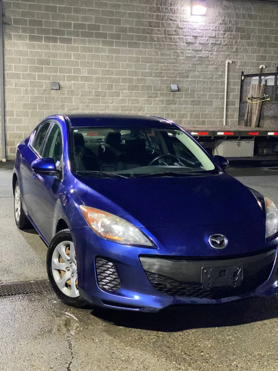 Blue four-door Mazda3 sedan. Automatic transmission. Interior features a clean dashboard and gauges.