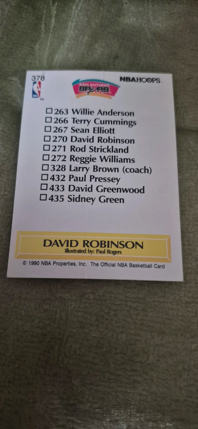 Selling a David Robinson NBA Hoops trading card! The back of the card lists other players from the San Antonio Spurs and is illustrated by Paul Rogers. A great collectible for any basketball fan!