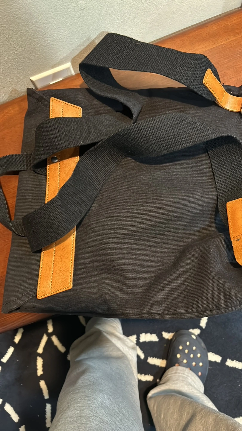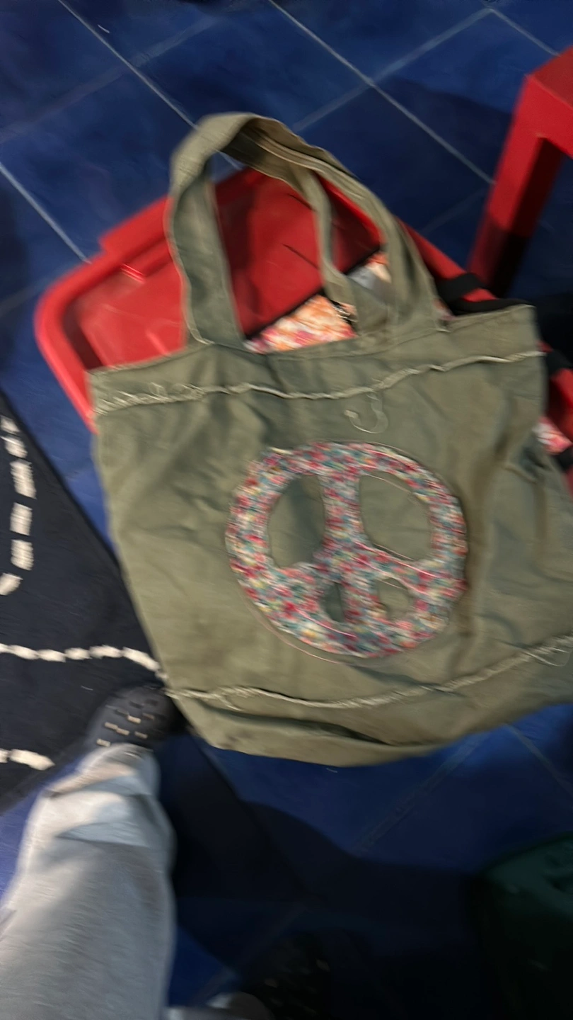 Large canvas tote bag with a peace sign patch. The bag is in good condition with no rips or tears. The bag is perfect for carrying books, groceries, or other everyday essentials.