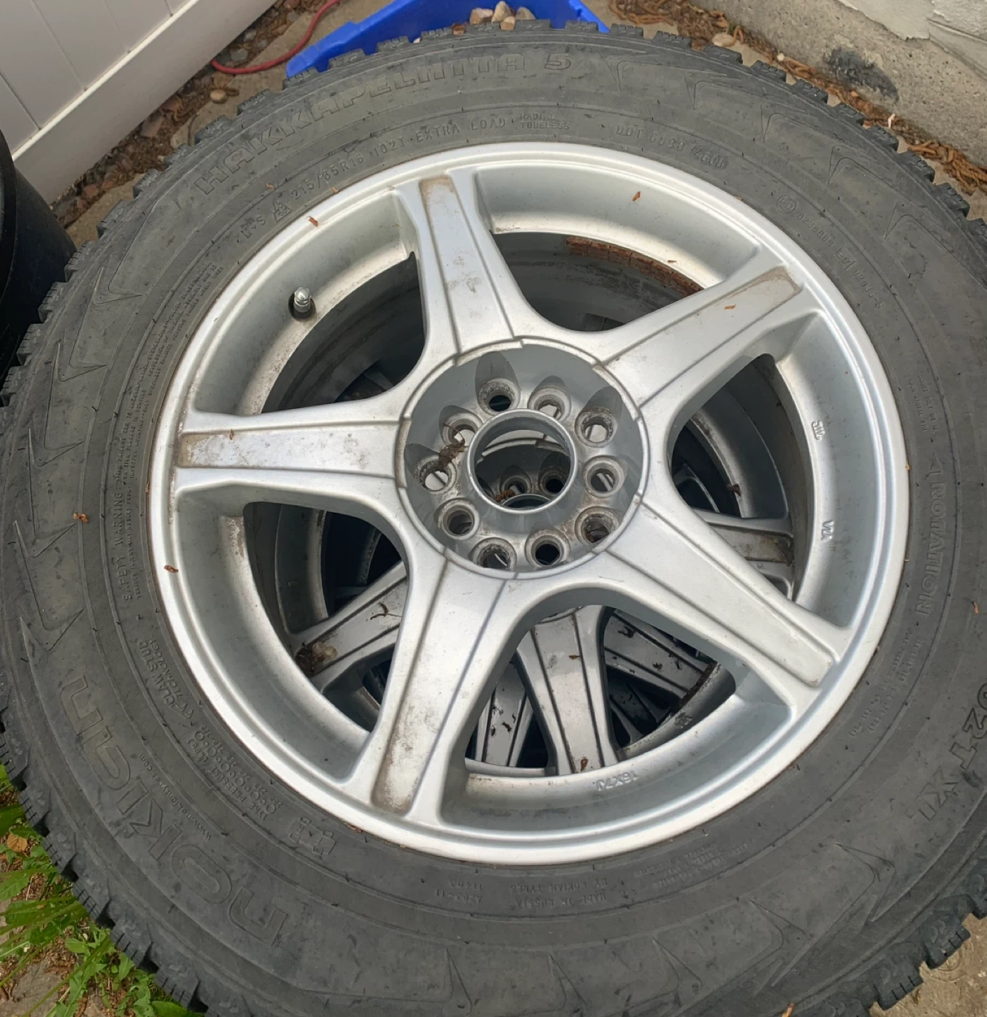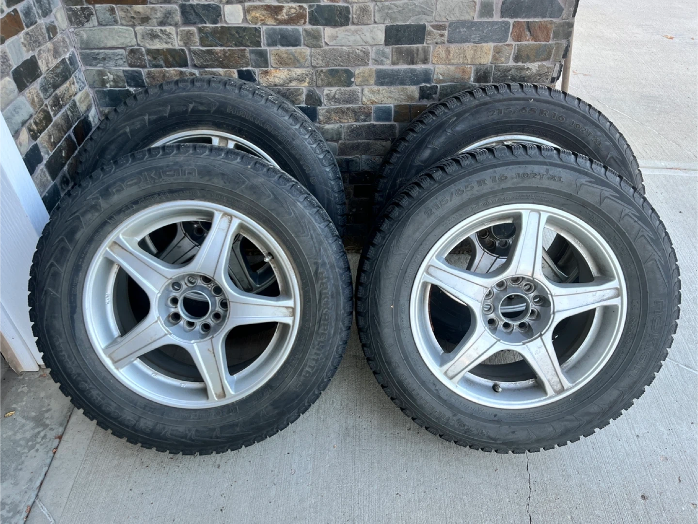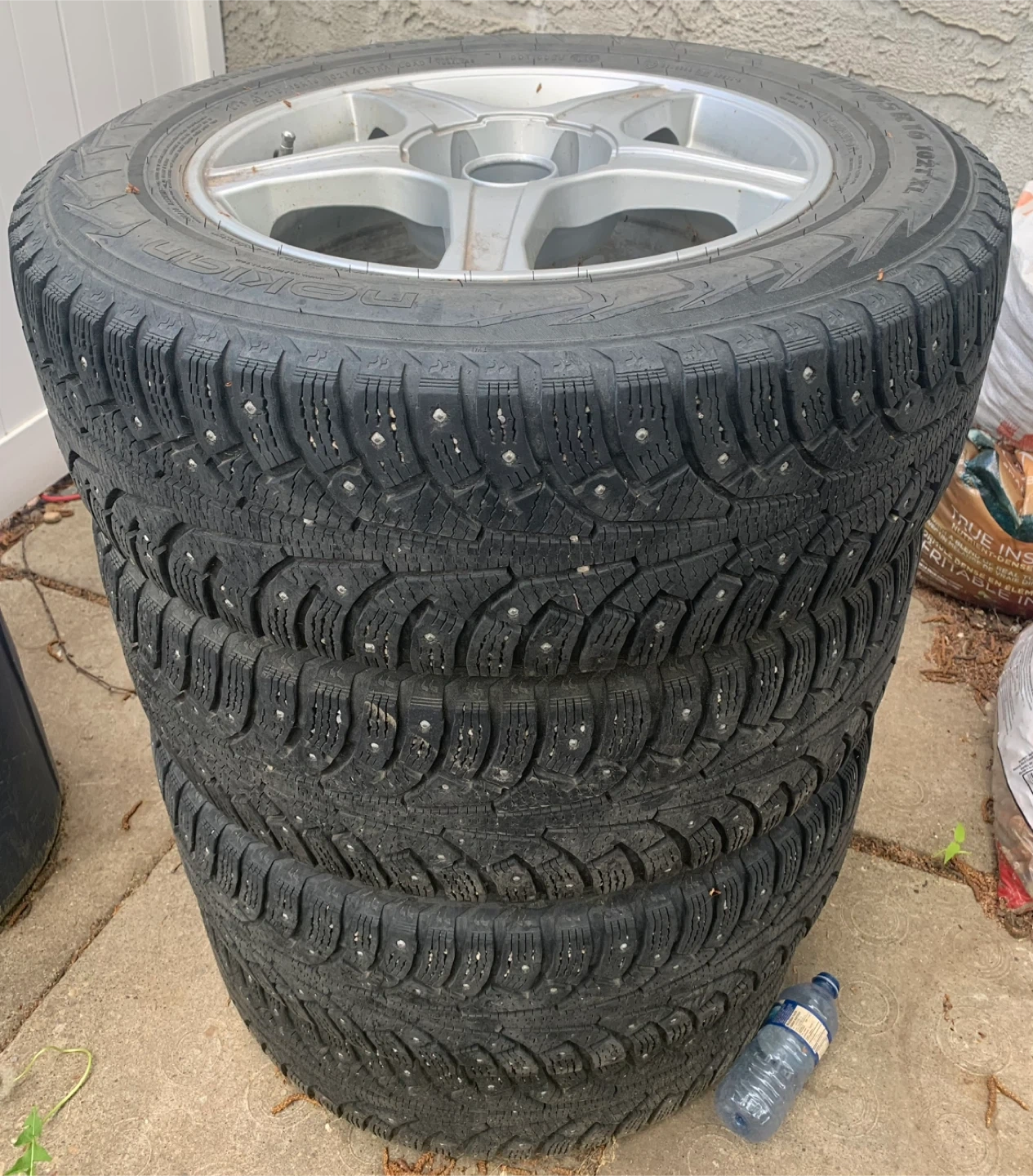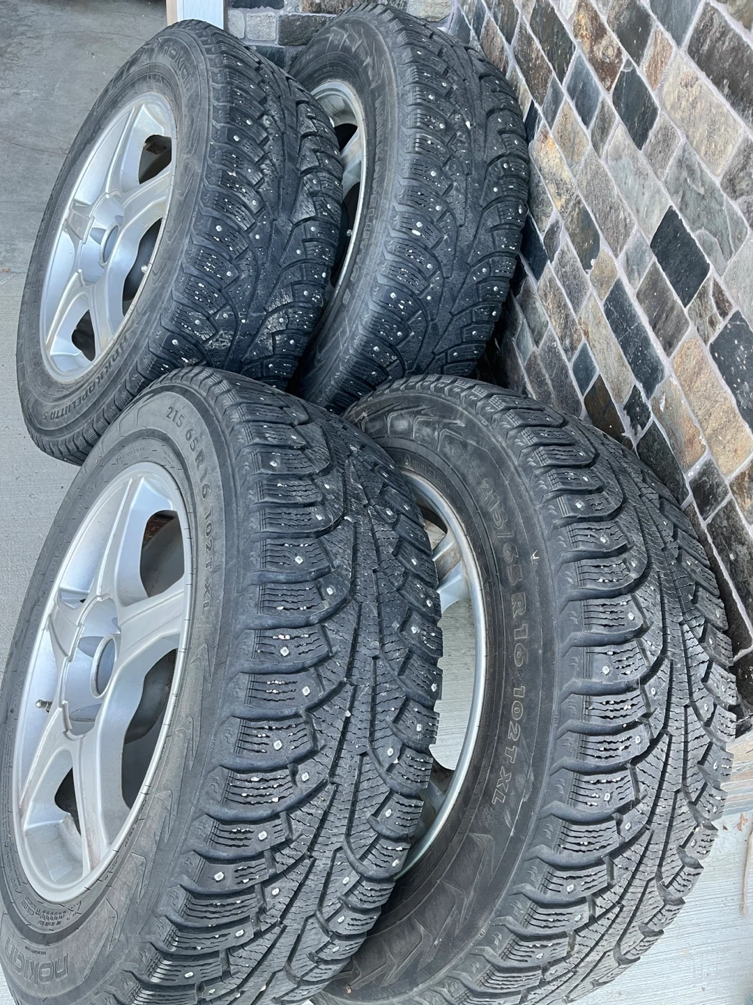 Selling a set of four winter tires. The size is 215/65 R16 102T XL. They have studs for extra grip in snowy conditions!