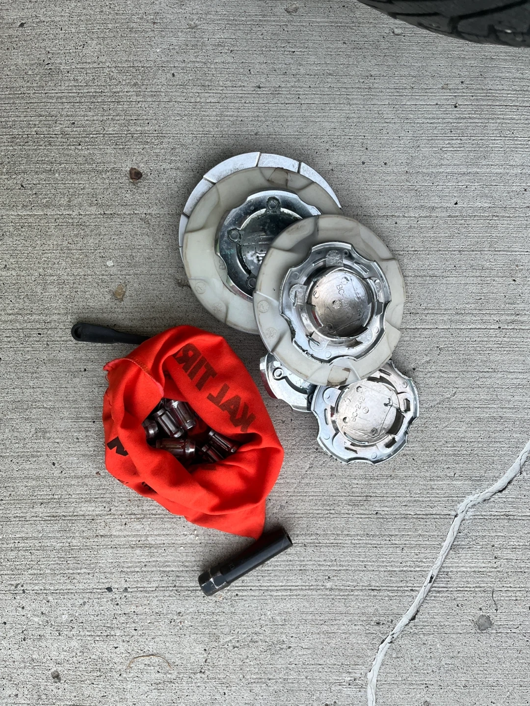 Includes a set of UNIVERSAL silver rims (some rust) centre caps, lug nuts and tool.
