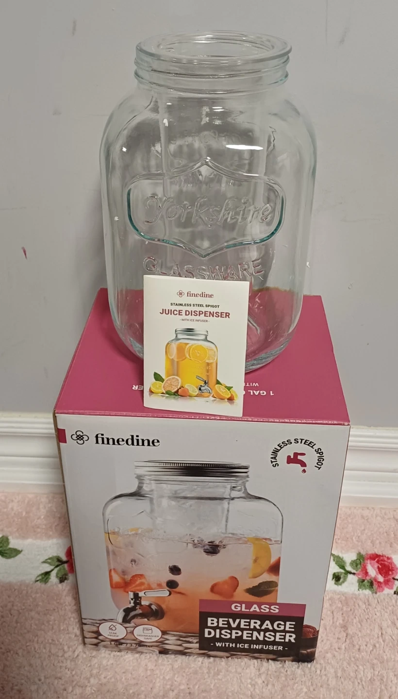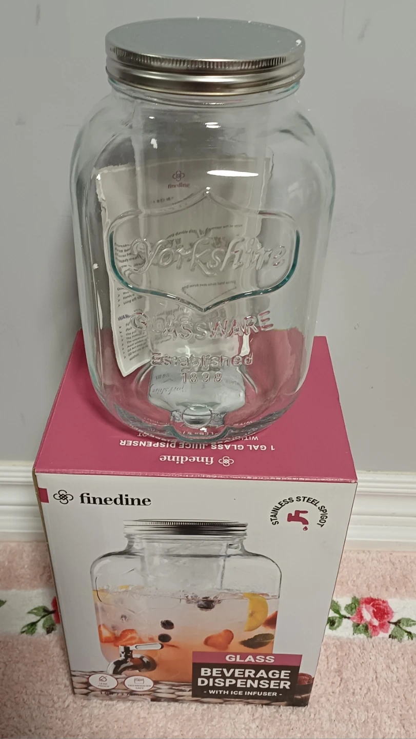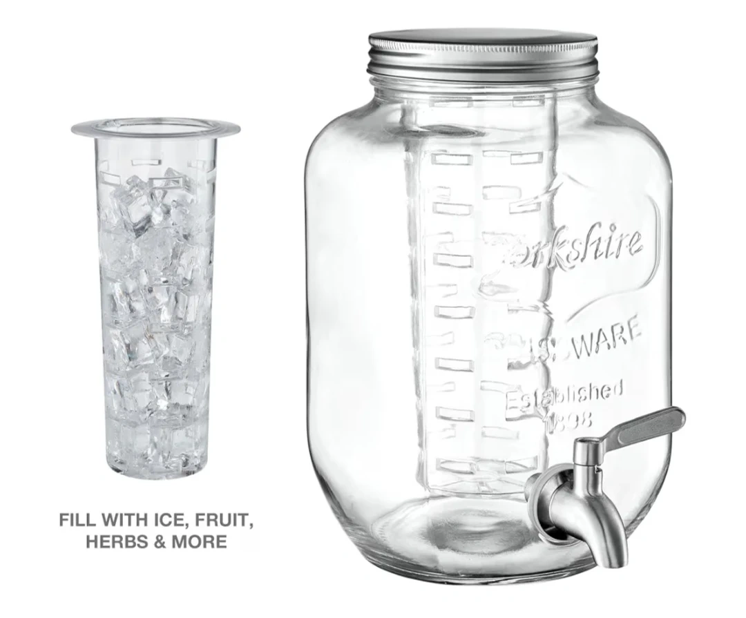 This Finedine glass beverage dispenser has a 1-gallon capacity. It's leak-proof and dishwasher safe. The included ice infuser keeps drinks cold without diluting them.
