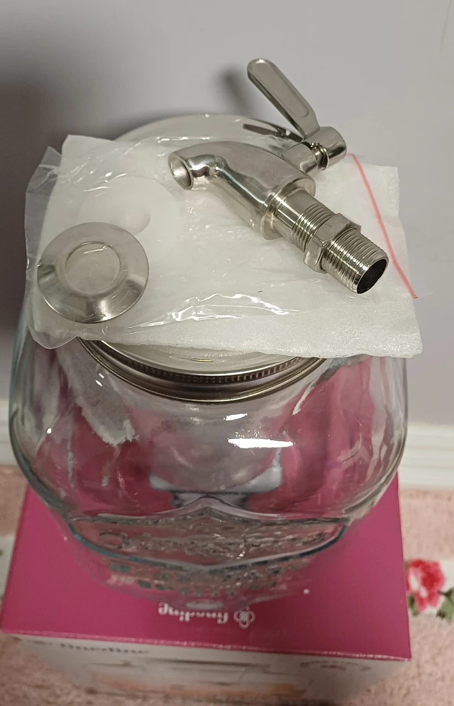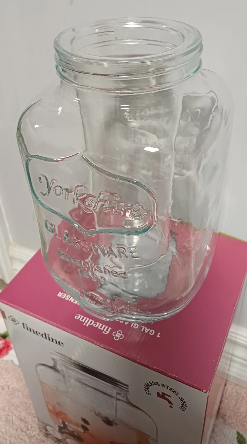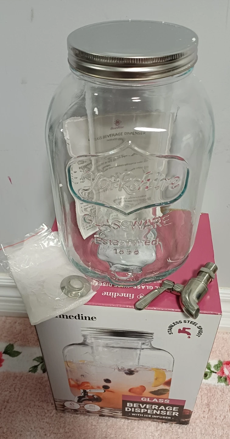 This Finedine glass beverage dispenser has a 1-gallon capacity. It's leak-proof and dishwasher safe. The included ice infuser keeps drinks cold without diluting them.