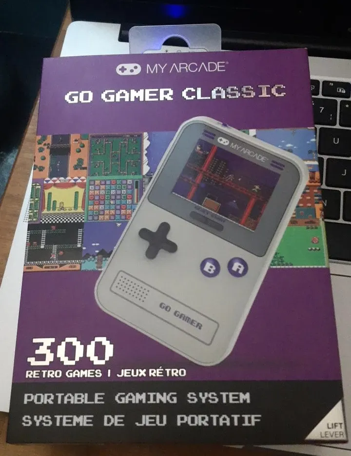 MY ARCADE GO GAMER CLASSIC portable gaming system. It's pre-loaded with 300 retro games. This handheld device is perfect for on-the-go fun!