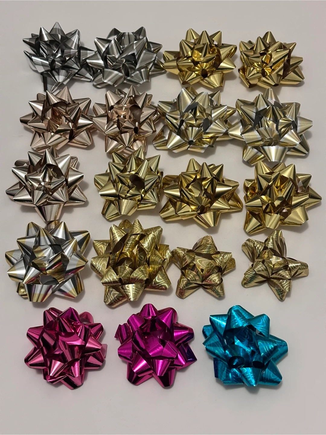 Selling a set of 23 assorted metallic gift bows! There are silver, gold, bronze, pink, and blue bows included. Perfect for adding a shiny touch to your gifts.