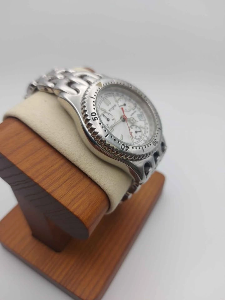 Elevate your timepiece collection with the rare and unique Wittnauer Quartz Swiss watch, a testament to classic design meeting modern precision. This men's wristwatch features a polished stainless steel case measuring 41mm in diameter with a complementary silver dial, exhibiting a geometric pattern and stick indexes for a clean, sophisticated look. The unidirectional rotating bezel adds a practical and stylish touch to this versatile timepiece, suitable for casual wear to sporty activities.
