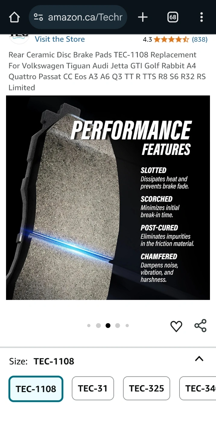 New, in sealed box. TEC, rear ceramic disc brake pads for European vehicles. Slotted and chamfered design. Includes hardware.