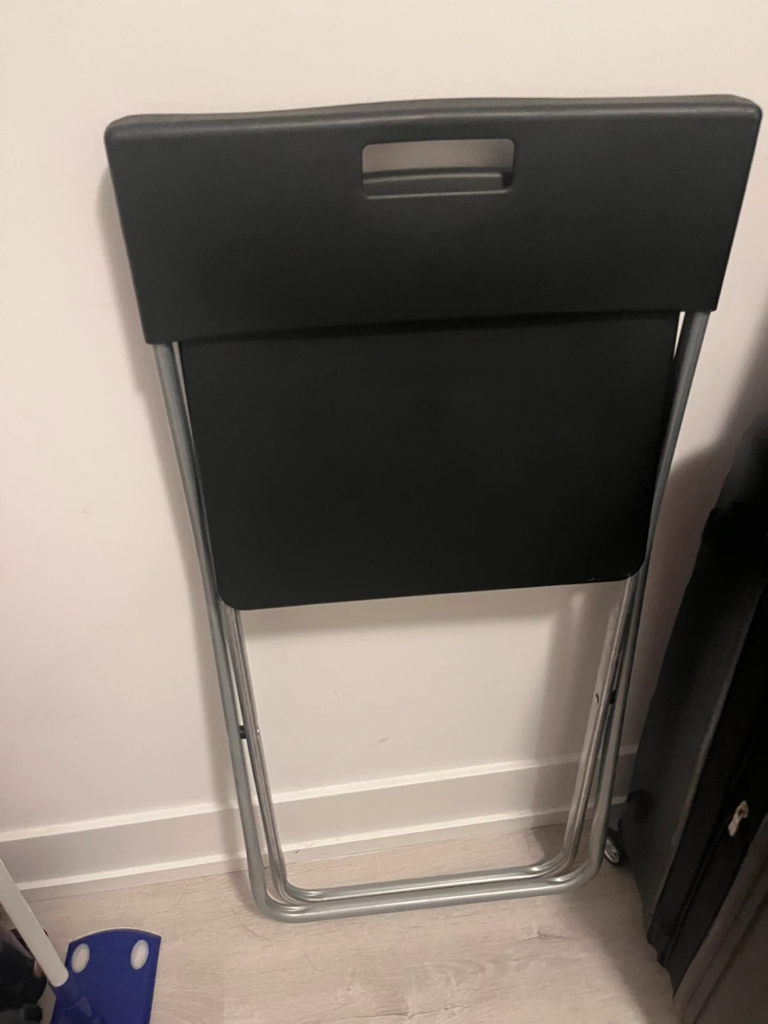 This is a black folding chair with a metal frame. It's easy to store and move around. Perfect for extra seating when you need it!