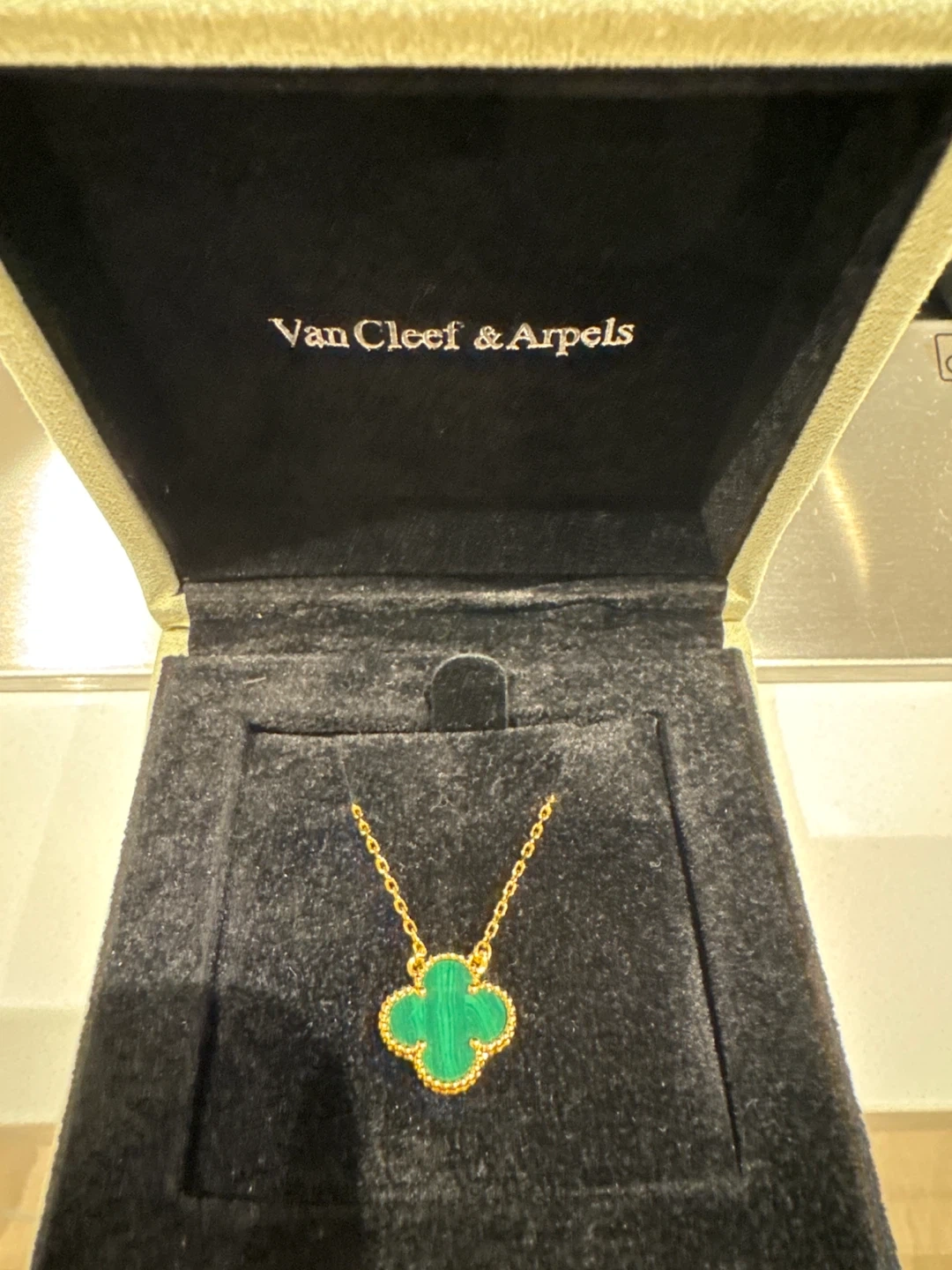 Beautiful Van Cleef & Arpels necklace. Features a malachite clover motif on a delicate gold chain. Includes original box.