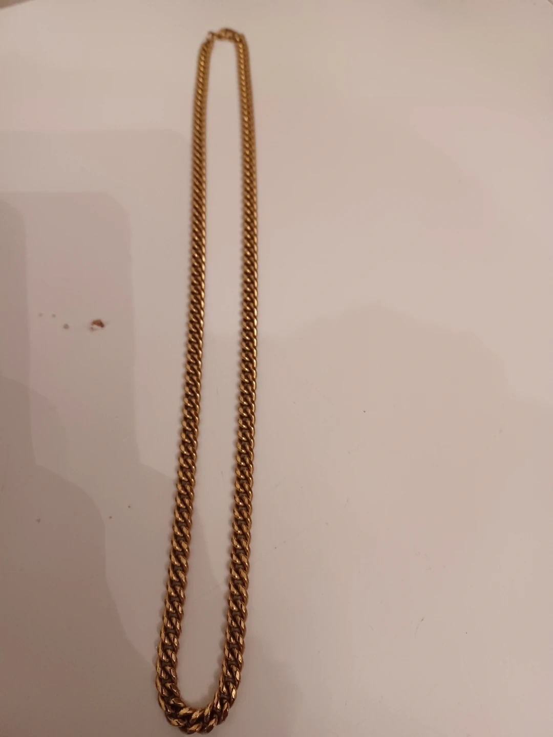 A stylish gold coloured Cuban link chain necklace. It has a secure clasp closure. This chain adds a nice touch to any outfit!