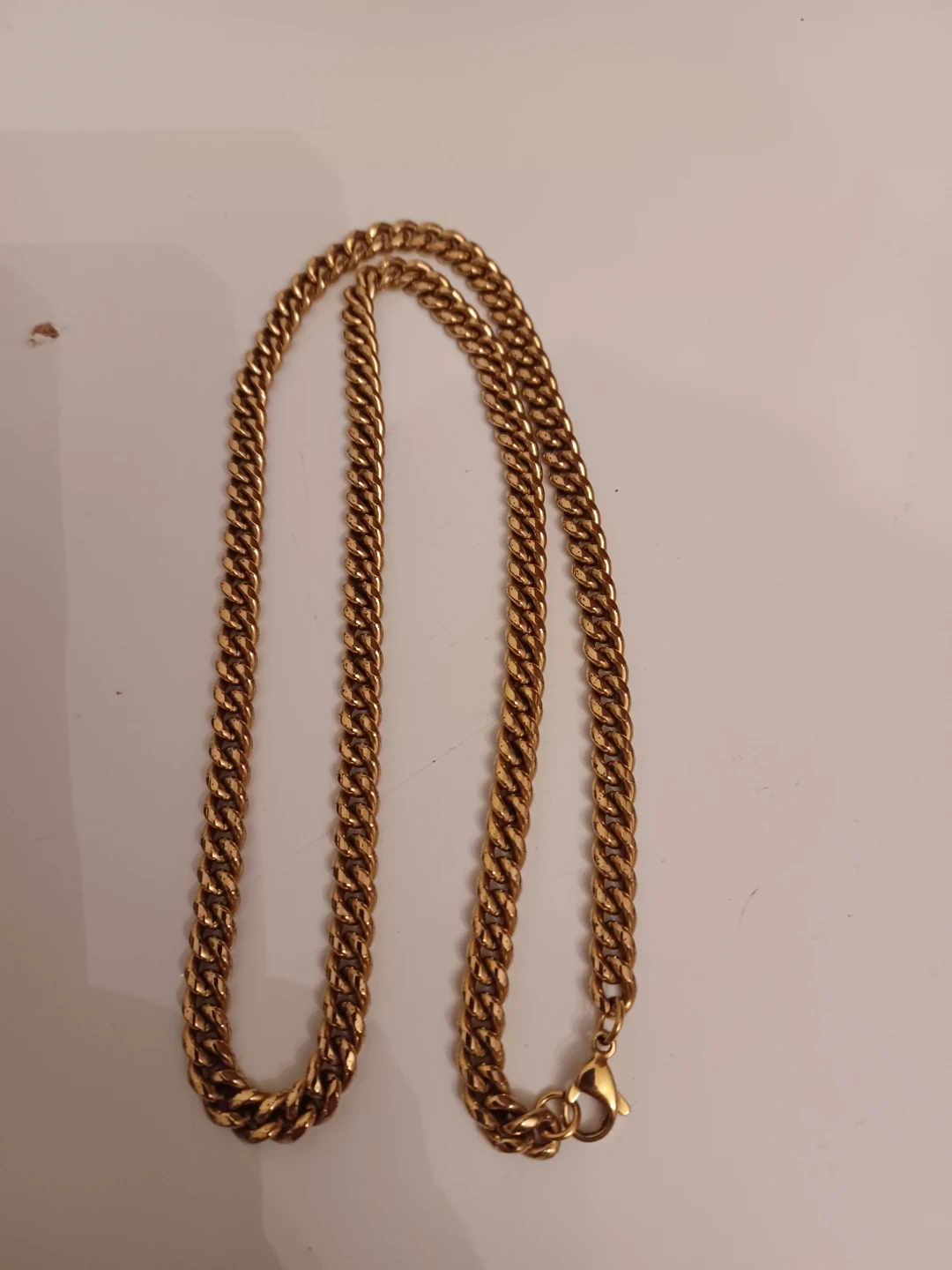 A stylish gold coloured Cuban link chain necklace. It has a secure clasp closure. This chain adds a nice touch to any outfit!