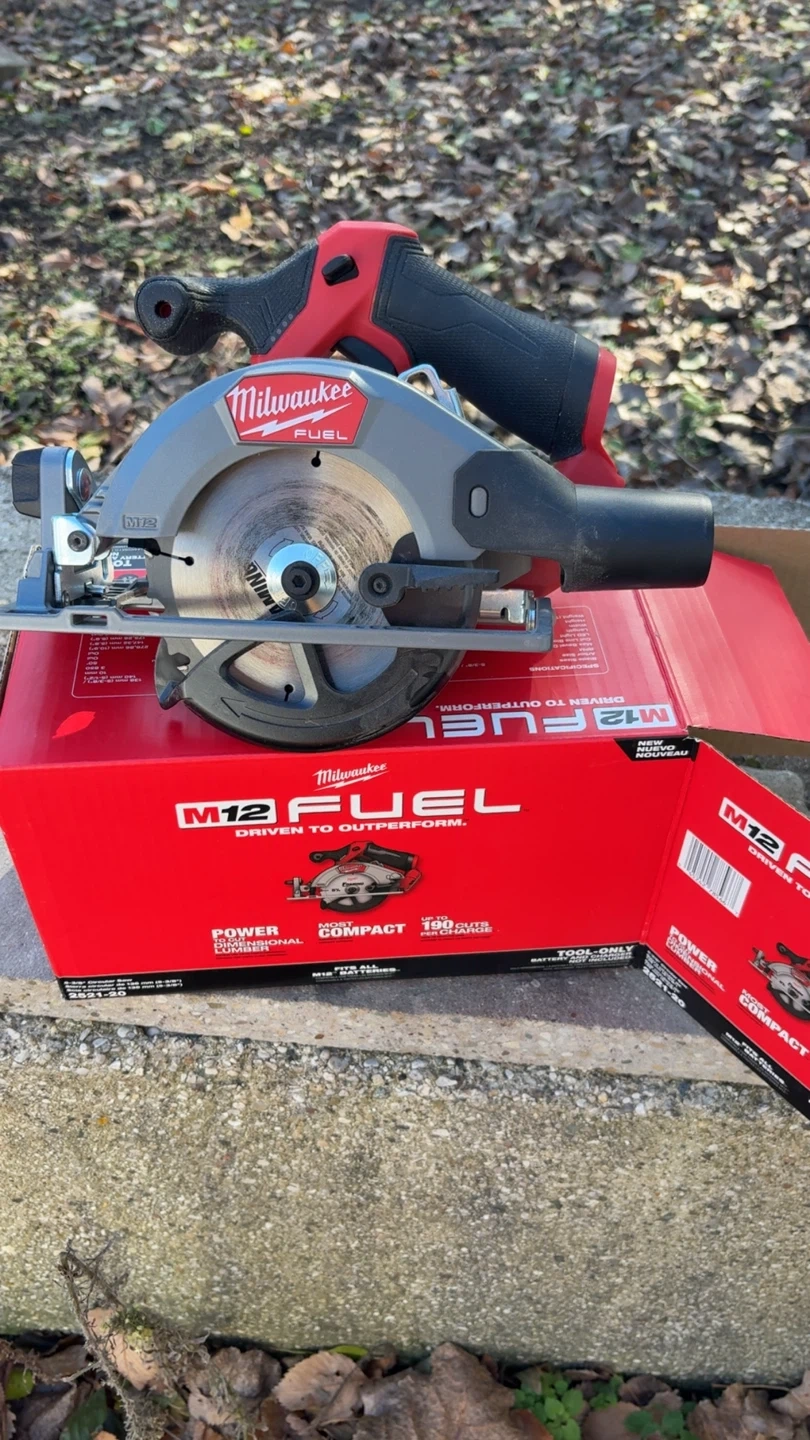 Selling a Milwaukee M12 FUEL circular saw. It's compact and powerful, perfect for dimensional lumber. The box states it can do up to 190 cuts per charge. Tool-only, battery not included