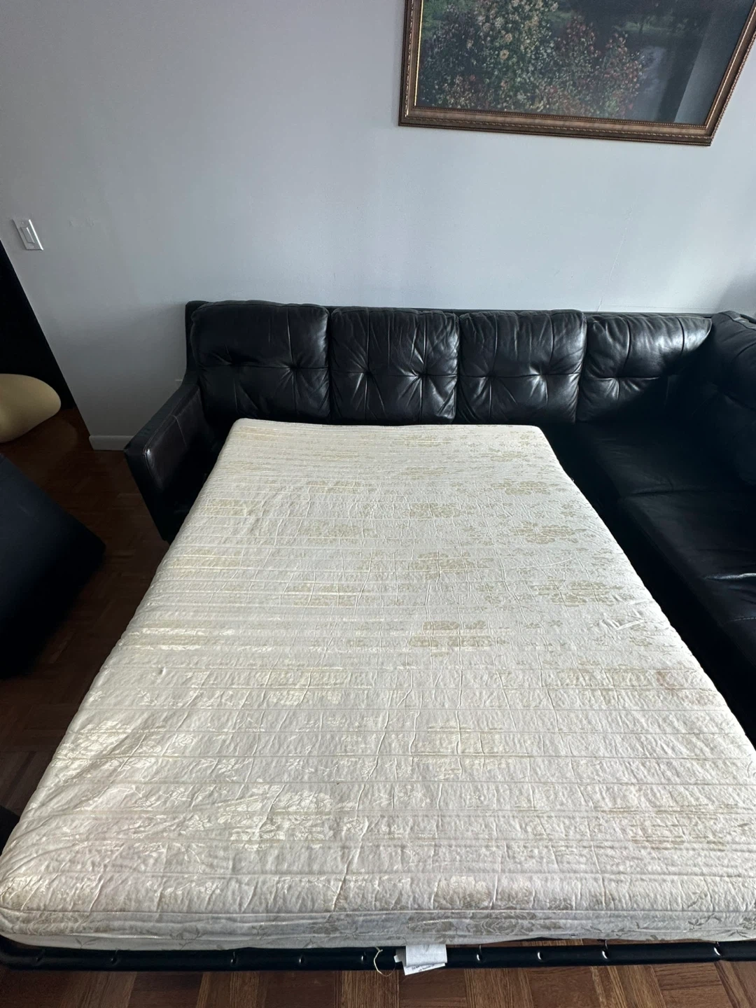 This is a dark brown leather sectional sofa. It features a chaise lounge and converts into a sleeper bed. The sofa is made of leather and includes a mattress for the sleeper function.