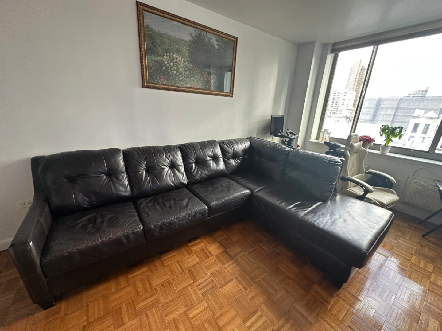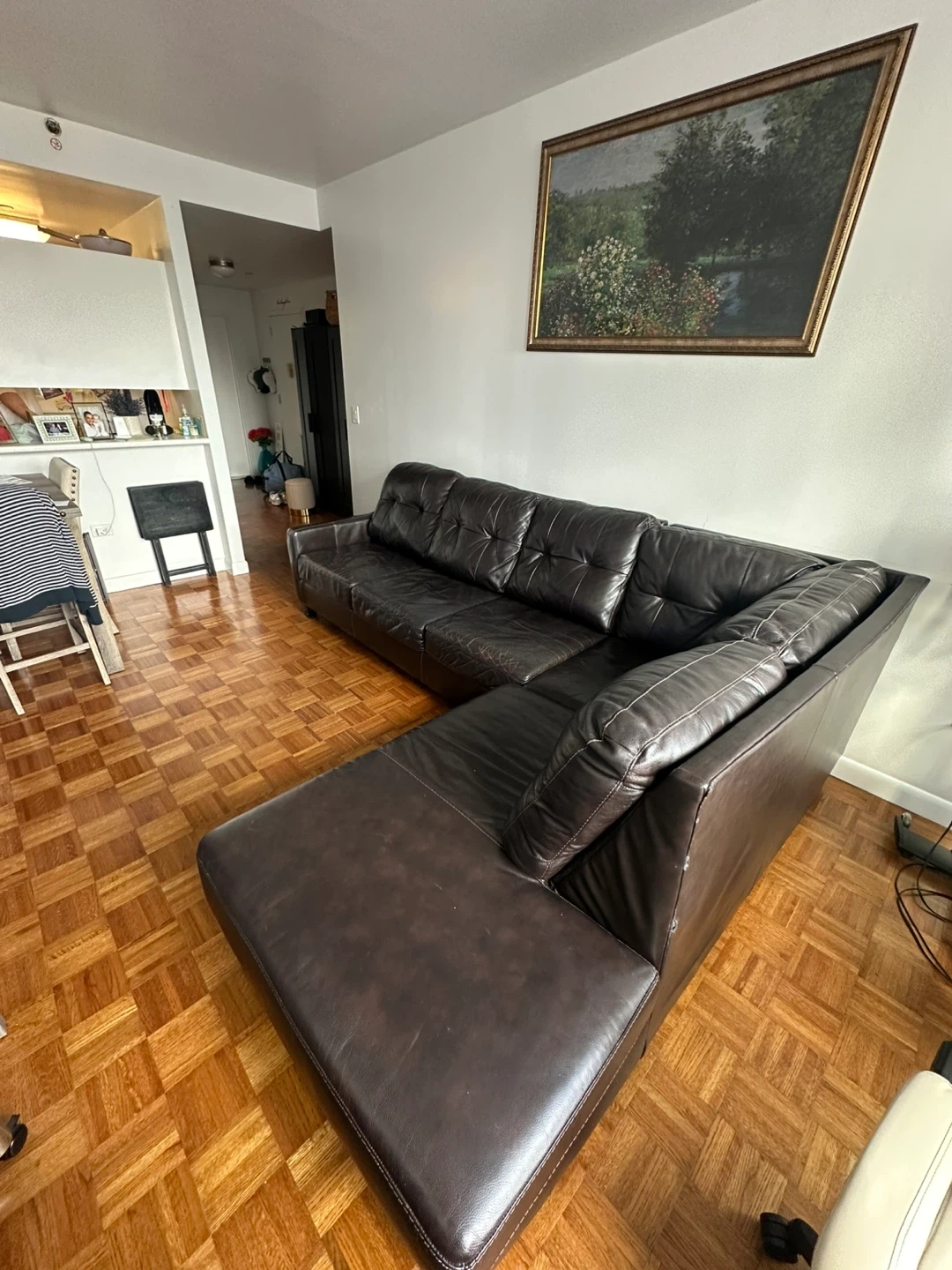This is a dark brown leather sectional sofa. It features a chaise lounge and converts into a sleeper bed. The sofa is made of leather and includes a mattress for the sleeper function.