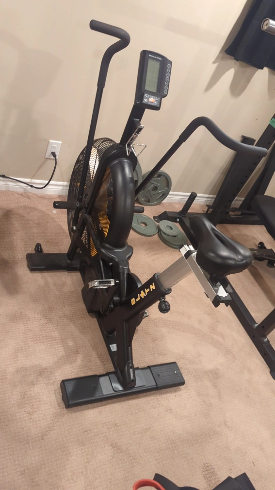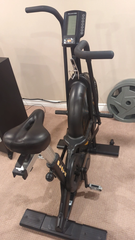 Air bike with a digital monitor. Adjustable seat and handlebars. Good for a full-body workout.