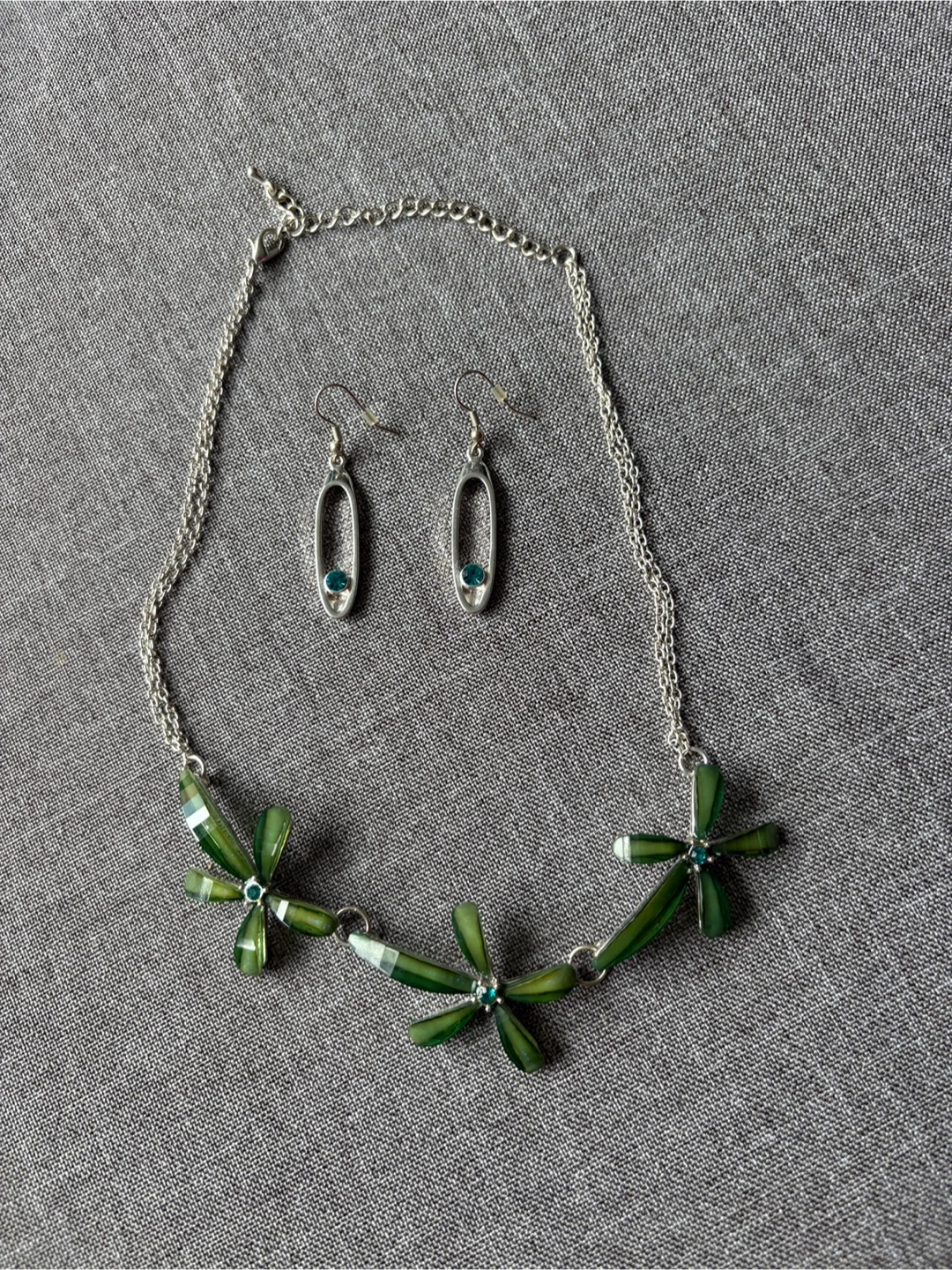Here's a lovely necklace and earring set featuring a green floral design. The set includes a necklace and matching earrings, perfect for adding a touch of nature-inspired style to your look